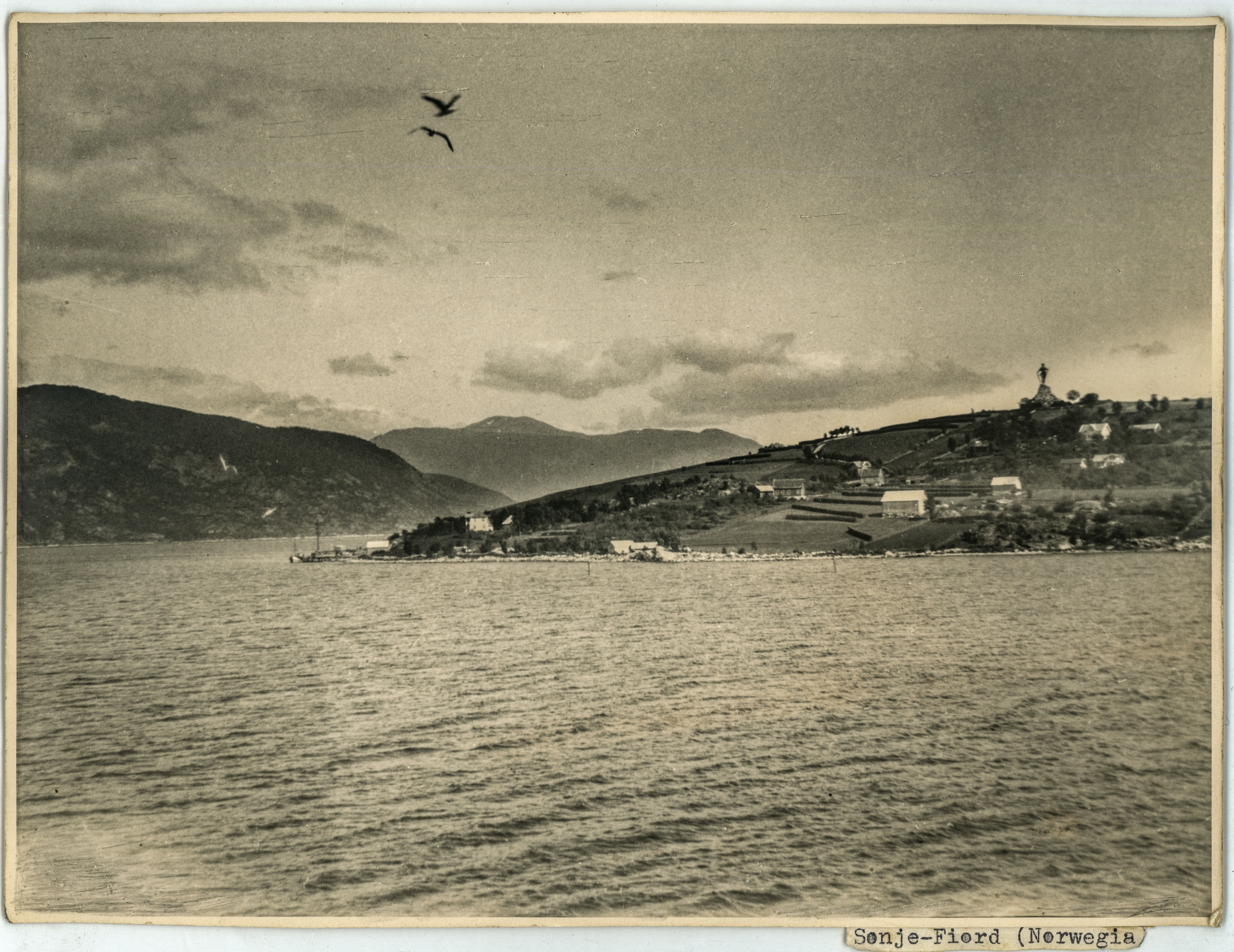 • fotografia ; krajobraz ; fiord ; Norwegia ; budynek ; wzgórze ; pomnik ; prom ; ptak