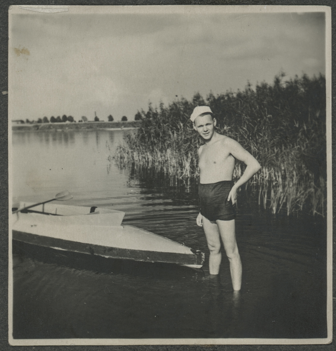 - fotografia ; mężczyzna ; moda ; moda międzywojenna ; strój kąpielowy ; czapka ; lato ; plaża ; jezioro ; kajak ; łódź