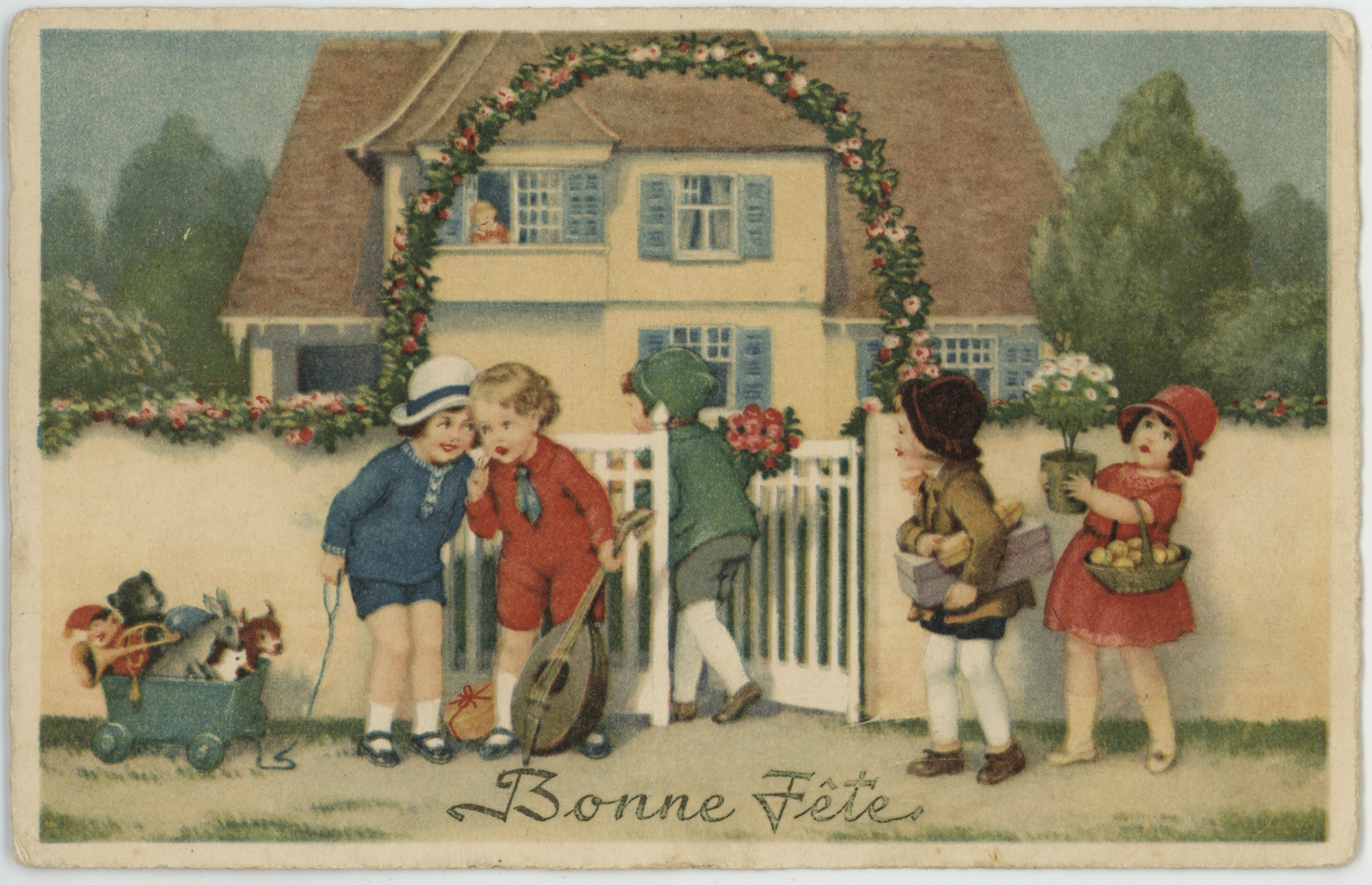 • pocztówka ; rysunek ; dziecko ; dziewczynka ; chłopiec ; moda ; przyjęcie urodzinowe ; urodziny ; prezent ; zabawka ; instrument muzyczny ; róża ; kwiat