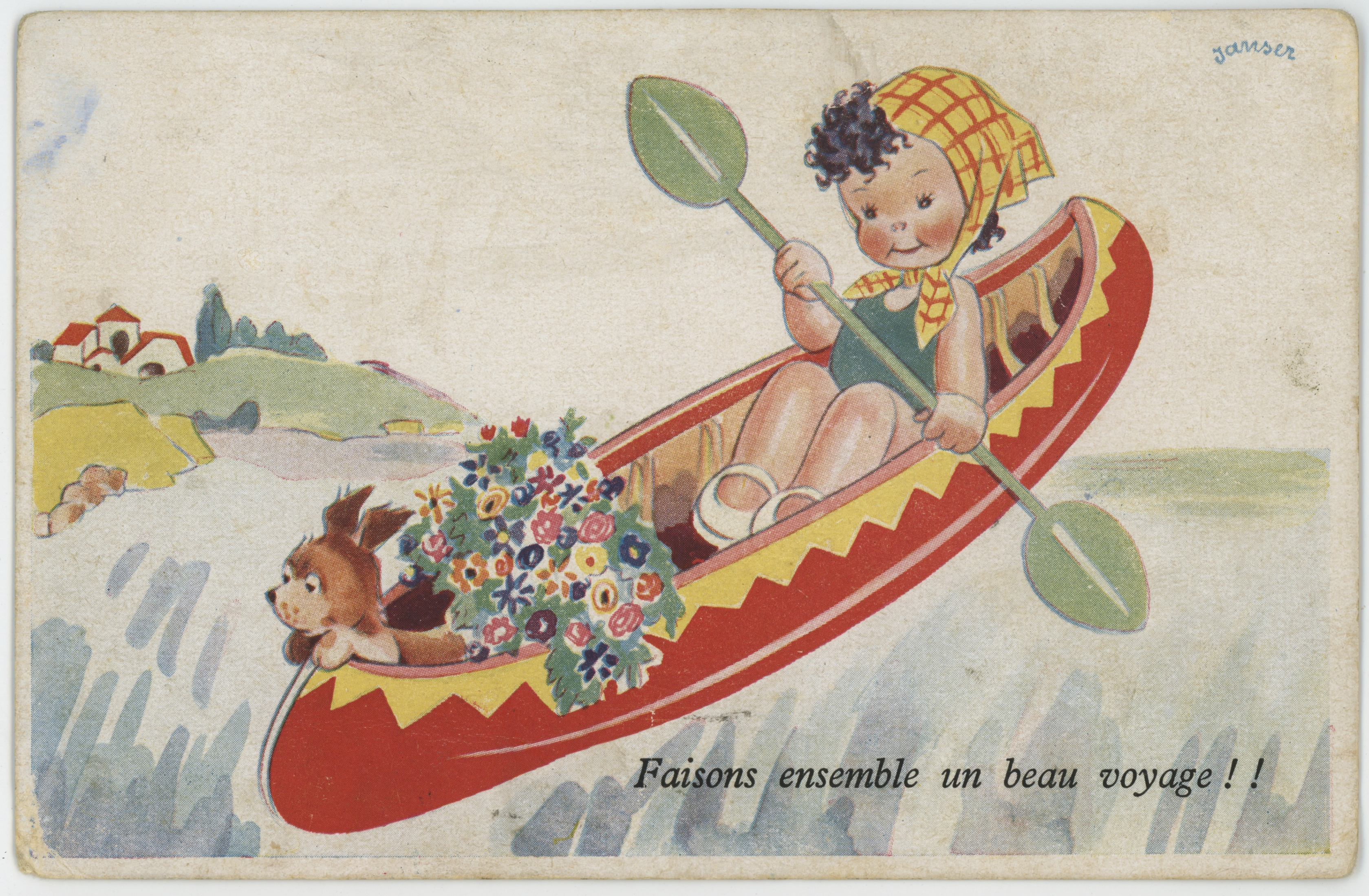 • pocztówka ; rysunek ; dziecko ; dziewczynka ; moda ; kajak ; wiosło ; pies ; kwiat