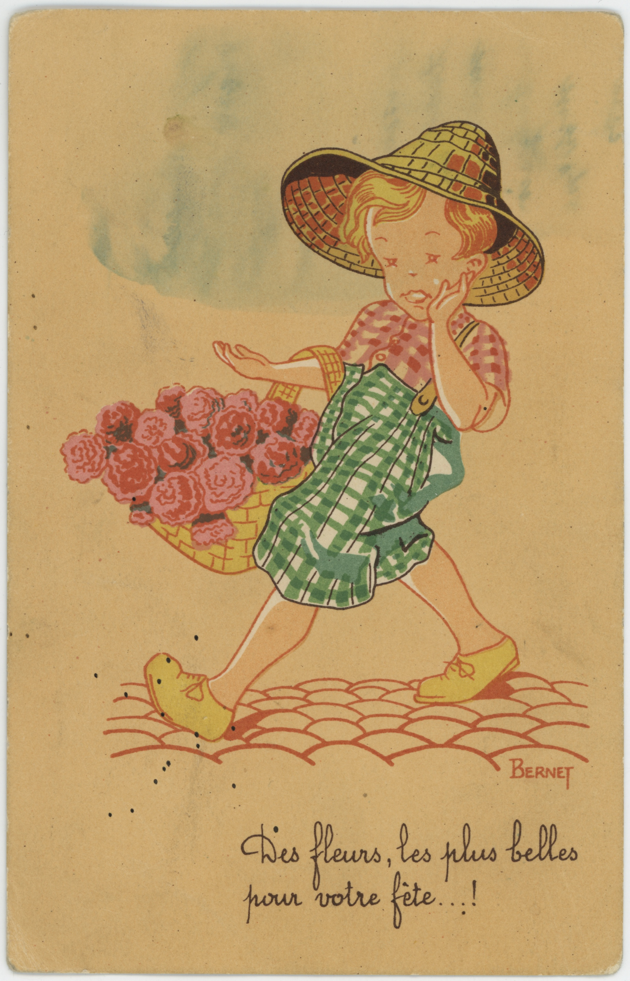 Pocztówka z dzieckiem niosącym kosz kwiatów