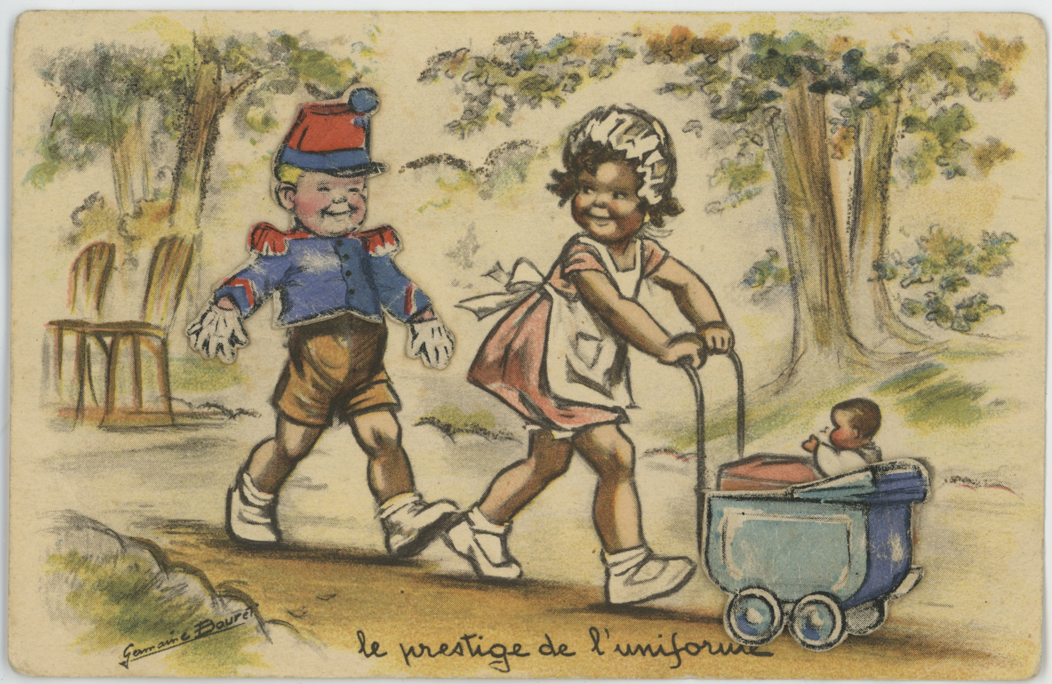 • pocztówka ; rysunek ; dziecko ; dziewczynka ; chłopiec ; moda ; mundur ; wózek dziecięcy