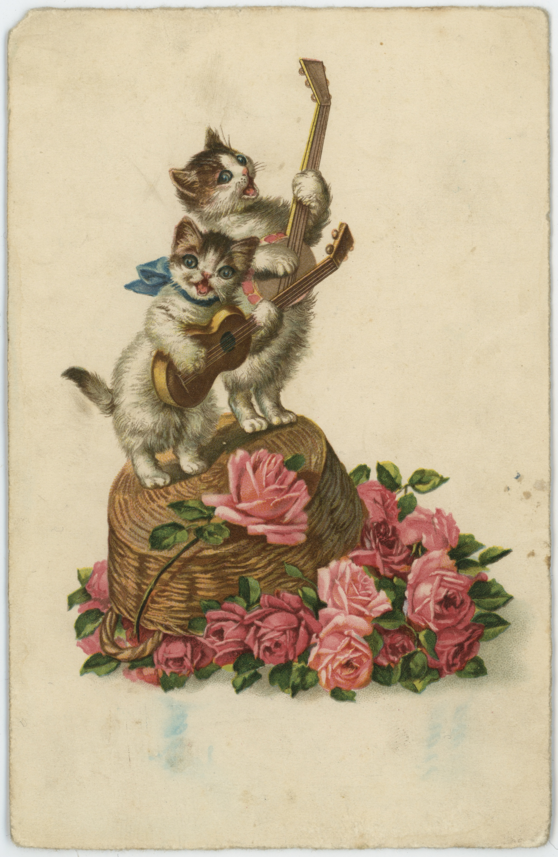 • pocztówka ; rysunek ; kot ; gitara ; mandolina ; kosz wiklinowy ; kwiat ; róża