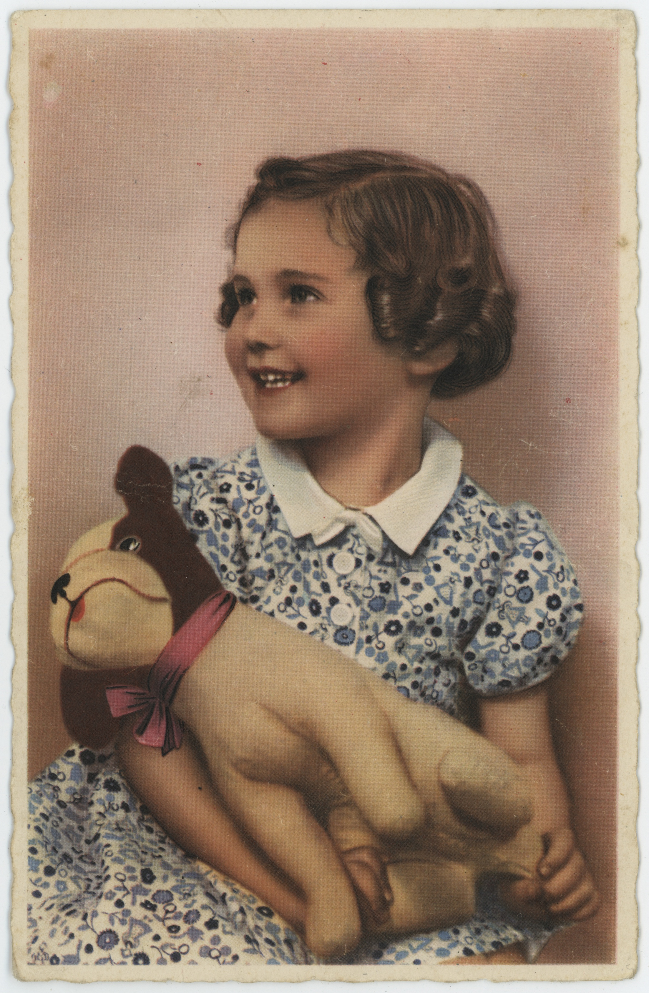 • pocztówka ; rysunek ; dziewczynka ; dziecko ; moda ; zabawka ; pies