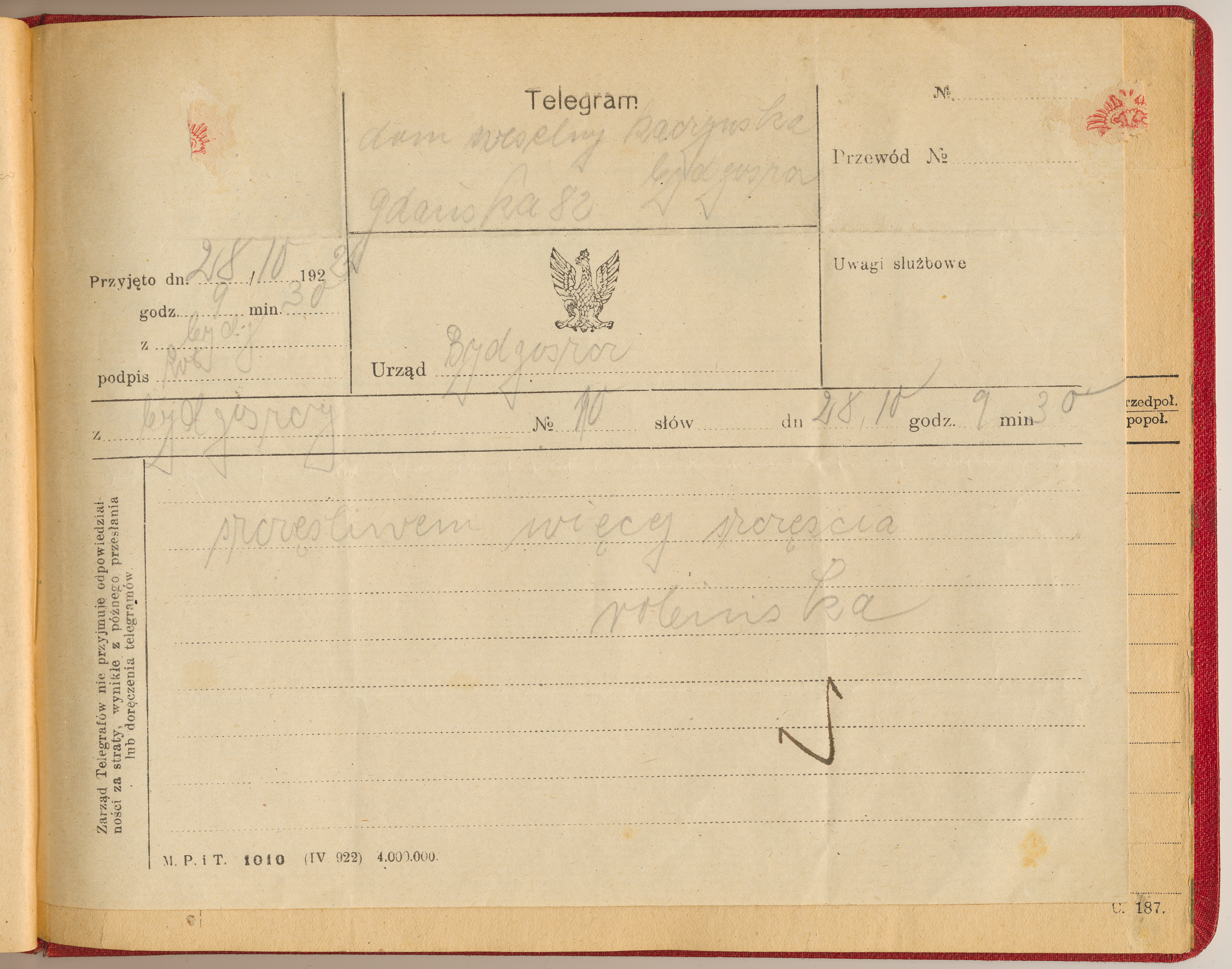 • telegram ; książeczka z telegramami ; korespondencja ; poczta ; ślub ; wesele ; małżeństwo ; życzenia ; zwyczaj ; Bydgoszcz