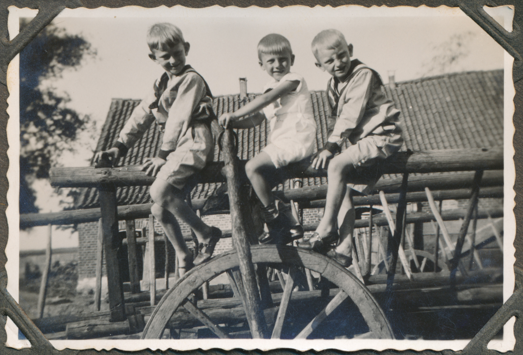• fotografia ; portret ; chłopiec ; dziecko ; moda ; rodzeństwo ; bliźniak ; wóz drabiniasty ; wóz drewniany