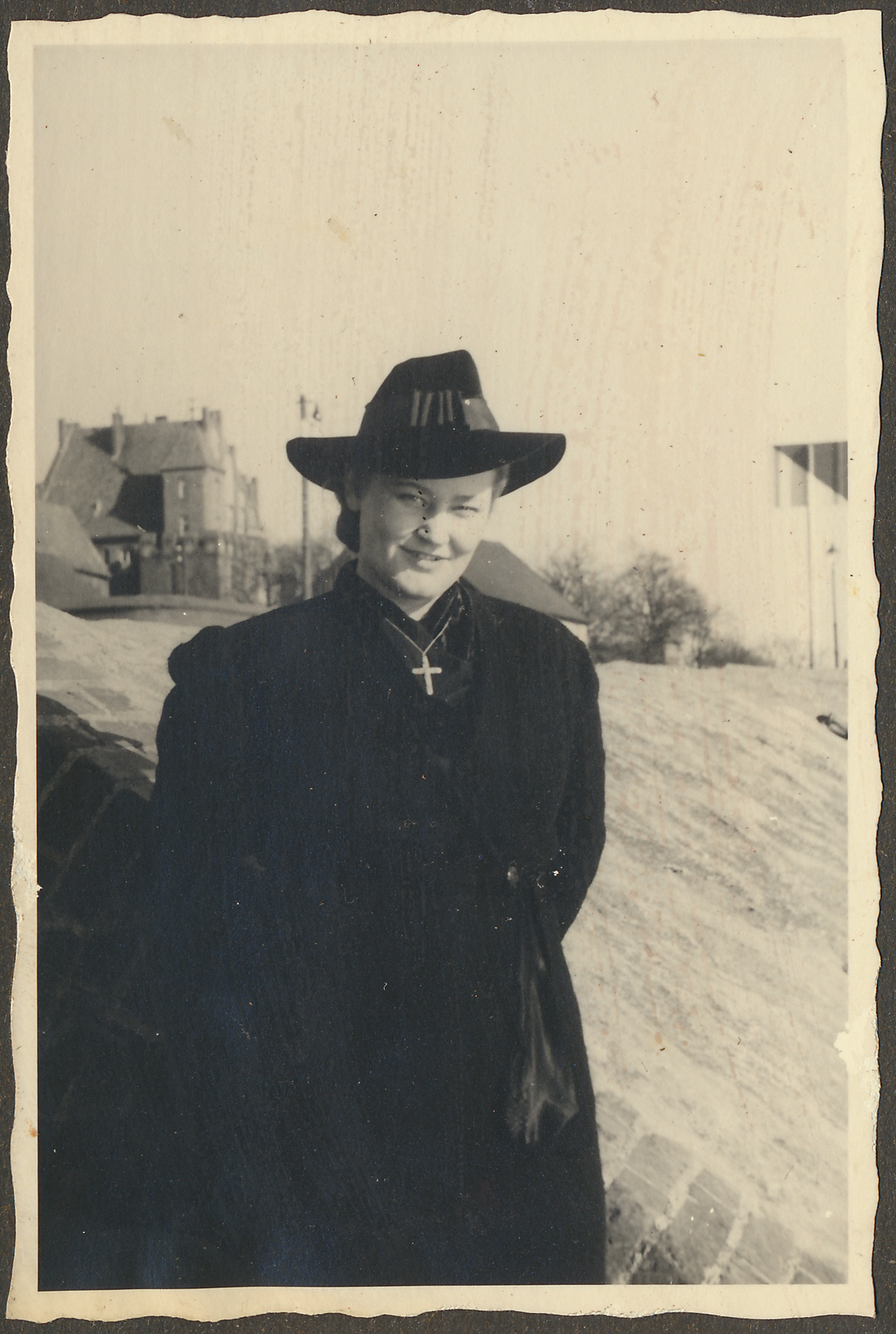 • fotografia ; portret ; kobieta ; moda ; kapelusz ; nakrycie głowy ; bulwar ; Brama Mostowa w Toruniu ; Dwór Mieszczański w Toruniu