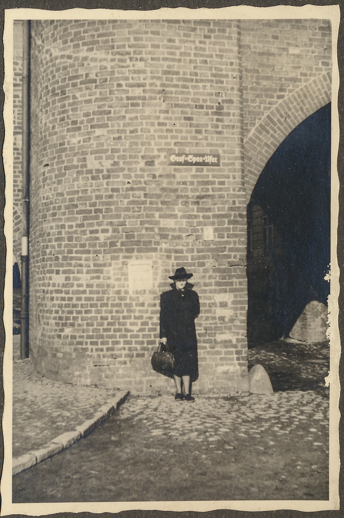 • fotografia ; portret ; kobieta ; moda ; kapelusz ; nakrycie głowy ; Brama Mostowa w Toruniu ; Graf-Spee-Ufer