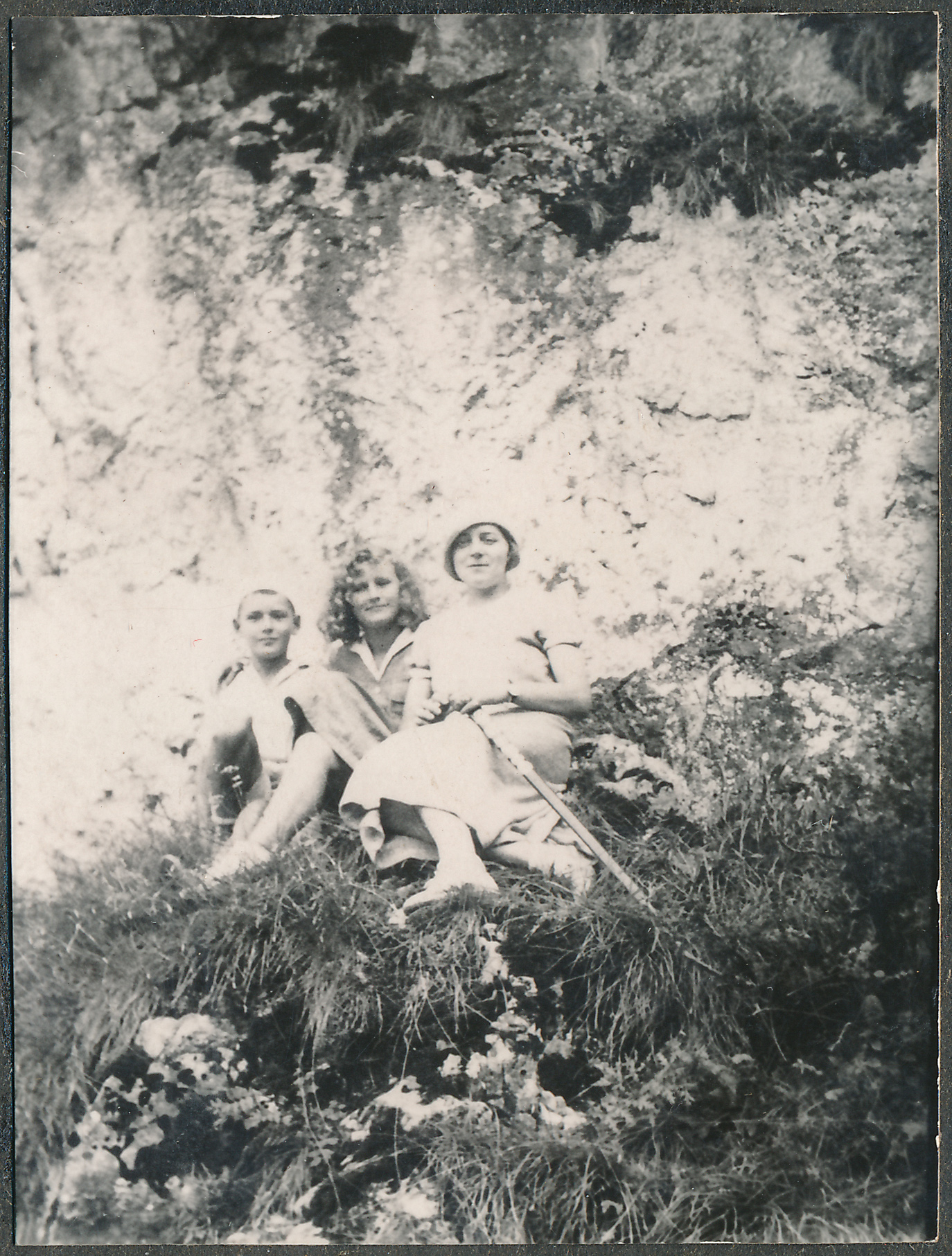 • fotografia ; kobieta ; dzieci ; chłopiec ; dziewczyna ; skała wapienna ; Jura Krakowsko-Częstochowska ; wycieczka ; moda międzywojenna ; laska