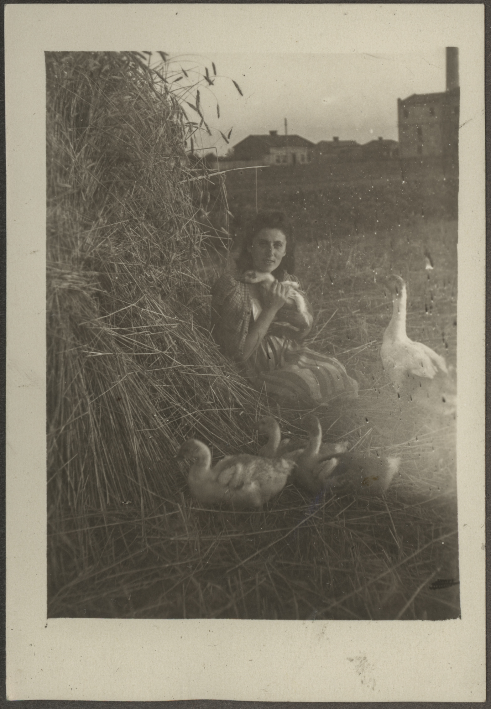 • fotografia ; kobieta ; pole ; wieś ; gęś ; stóg ; budynek ; komin
