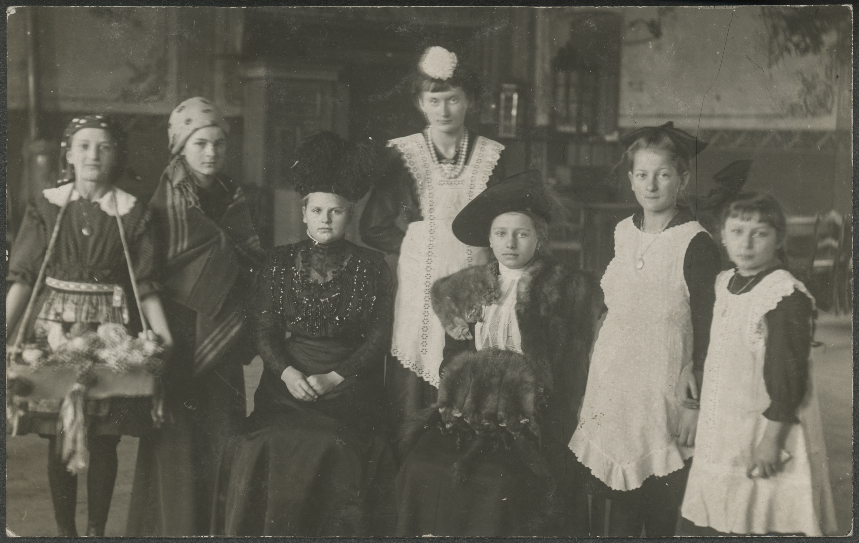 - fotografia ; portret ; kobieta ; dziewczynka ; moda ; przebranie ; strój ; nakrycie głowy ; kapelusz ; mufka ; lis ; pokojówka ; służąca