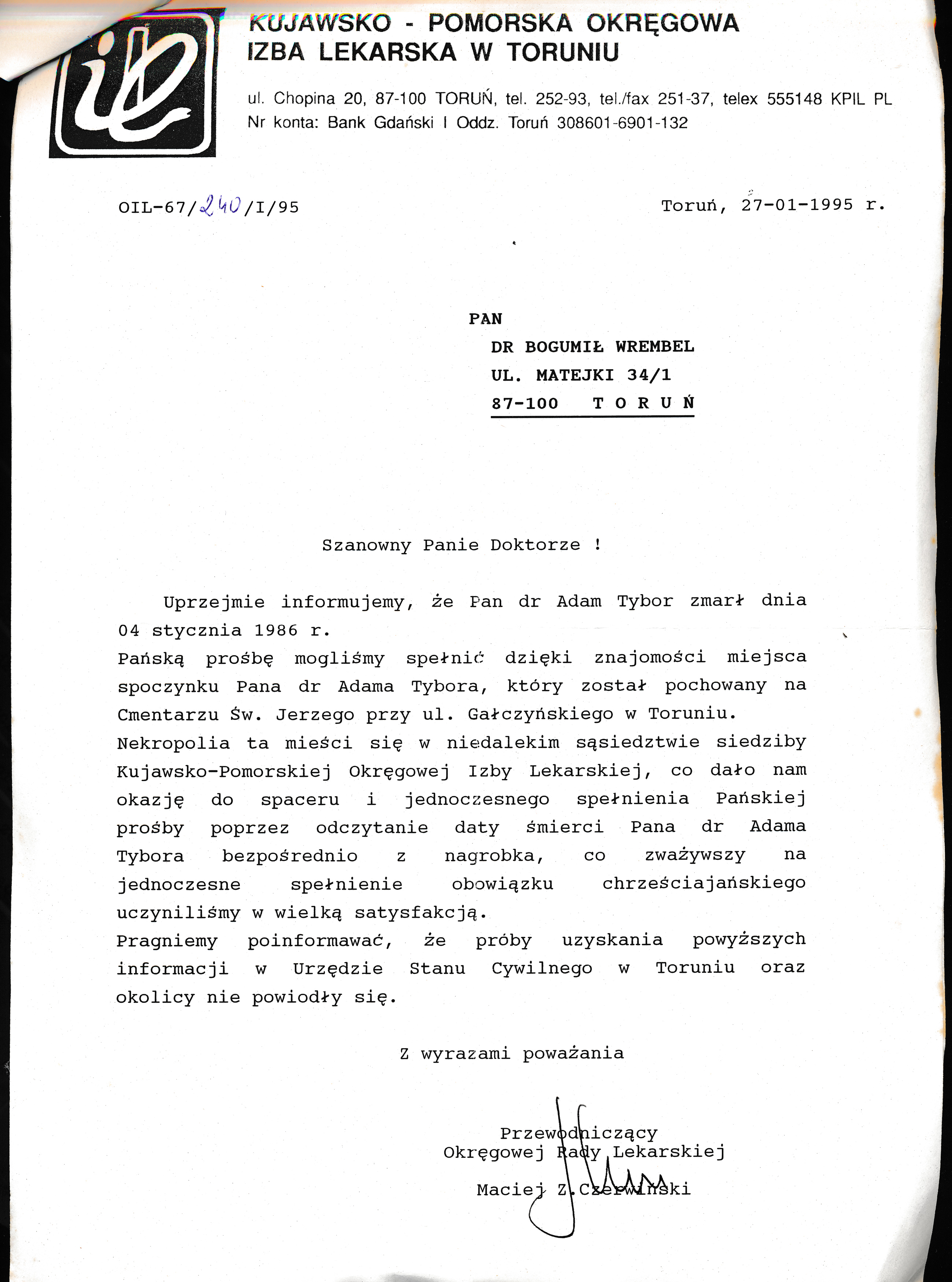 Pismo do doktora Bogumiła Wrembla