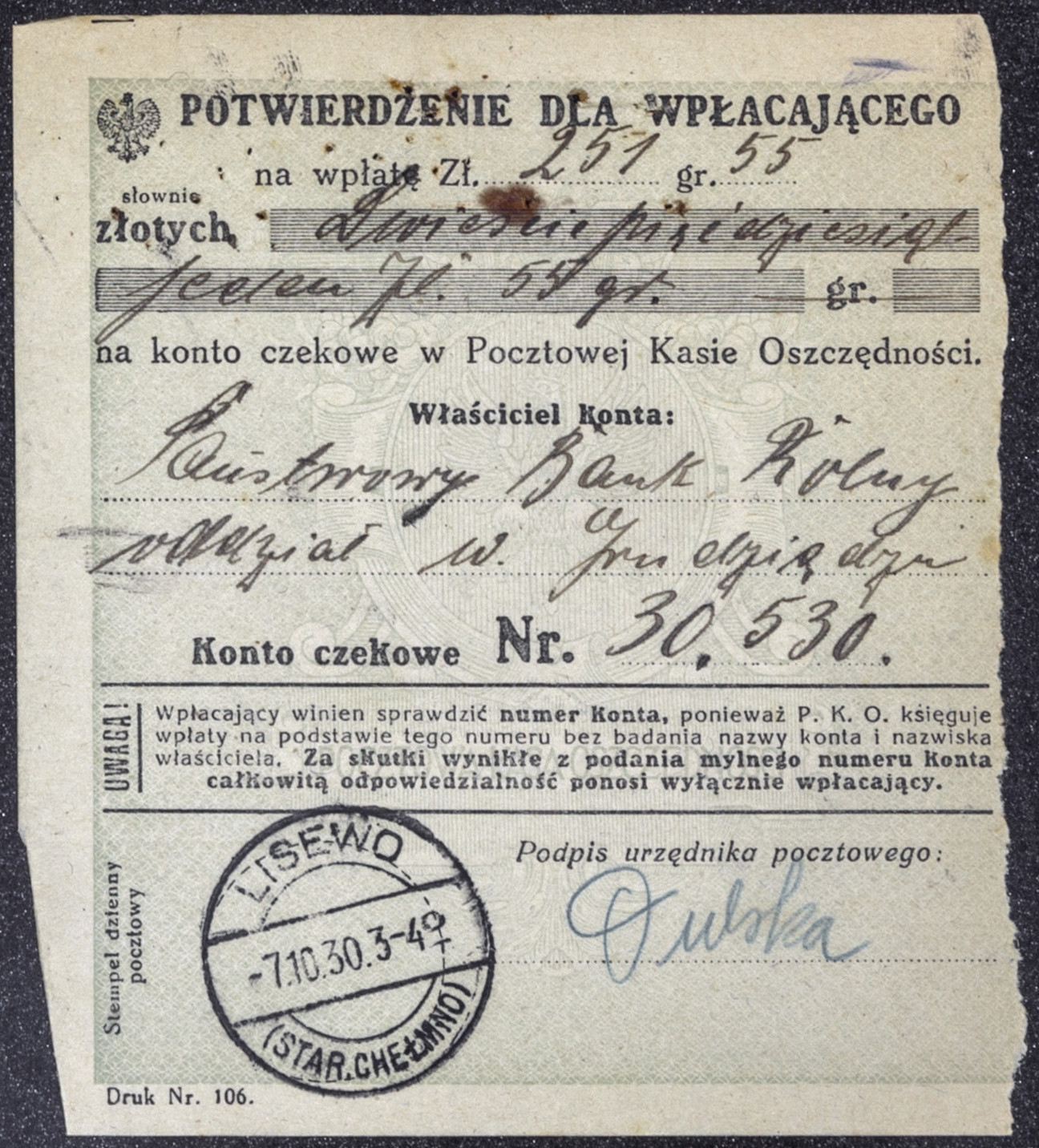 • dokument ; potwierdzenie wpłaty ; Państwowy Bank Rolny Oddział w Grudziądzu ; konto czekowe ; Pocztowa Kasa Oszczędności ; stempel ; Lisewo ; Poczta Polska