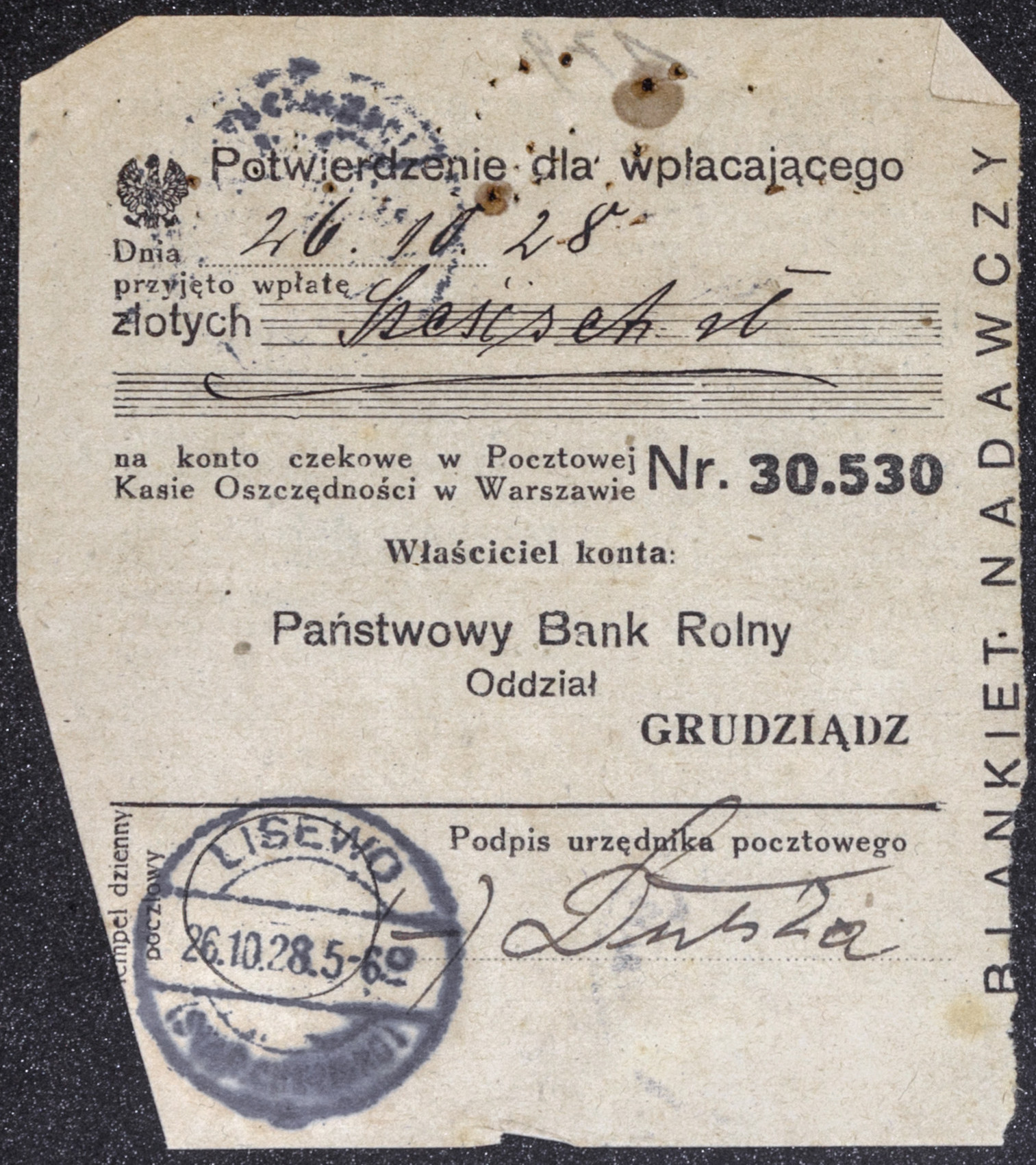 • dokument ; potwierdzenie wpłaty ; Państwowy Bank Rolny Oddział w Grudziądzu ; konto czekowe ; Pocztowa Kasa Oszczędności ; stempel ; Lisewo ; Poczta Polska ; regulamin ; blankiet nadawczy