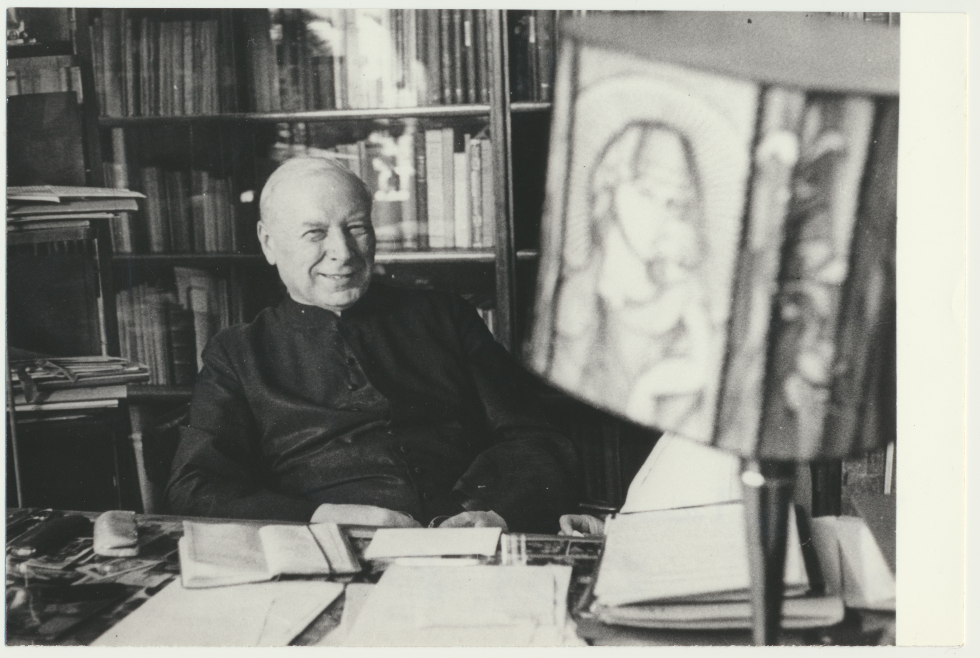 - fotografia ; portret ; lampa ; kardynał ; Prymas Tysiąclecia ; prymas Polski ; biurko ; regał ; książka ; Matka Boska
