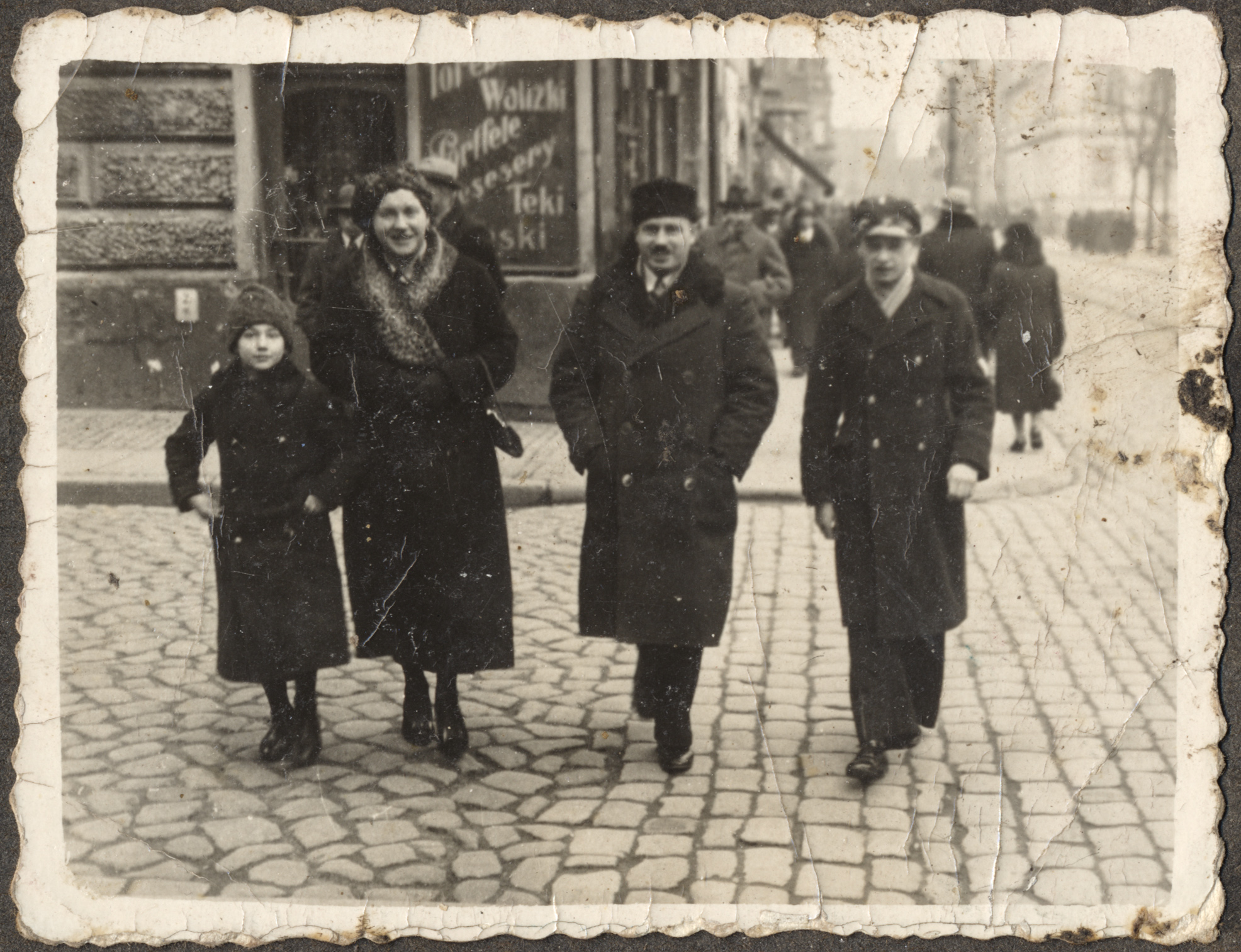 • fotografia ; portret ; spacer ; ulica ; kamienica ; szyld ; sklep ; moda ; moda międzywojenna ; kobieta ; mężczyzna ; dziecko
