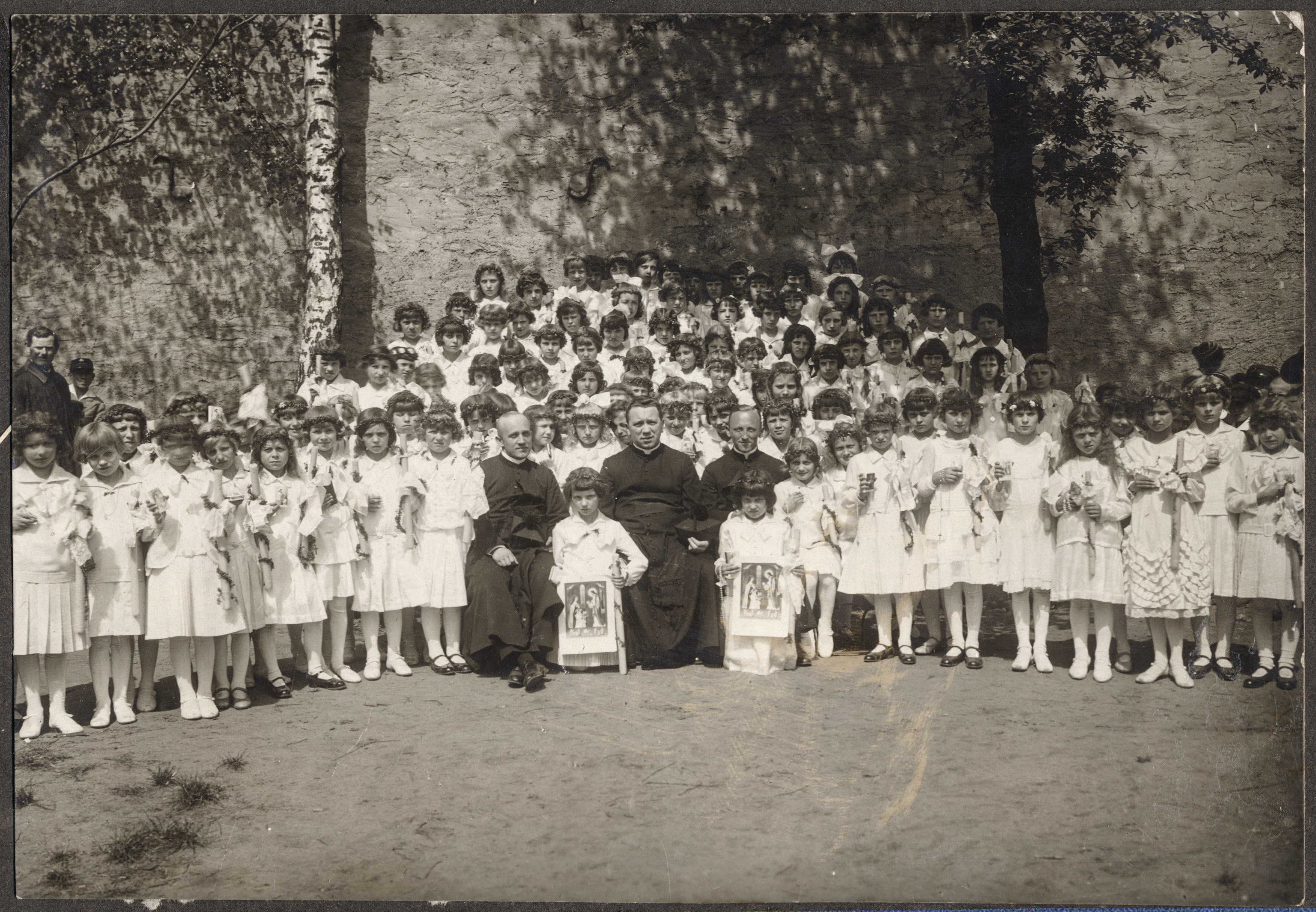 • fotografia ; portret ; Pierwsza Komunia Święta ; dzieci ; dziewczynka ; moda ; moda komunijna ; książeczka ; różaniec ; świeca ; gromnica ; pamiątka Pierwszej Komunii Świętej ; ksiądz ; religia ; uroczystość religijna