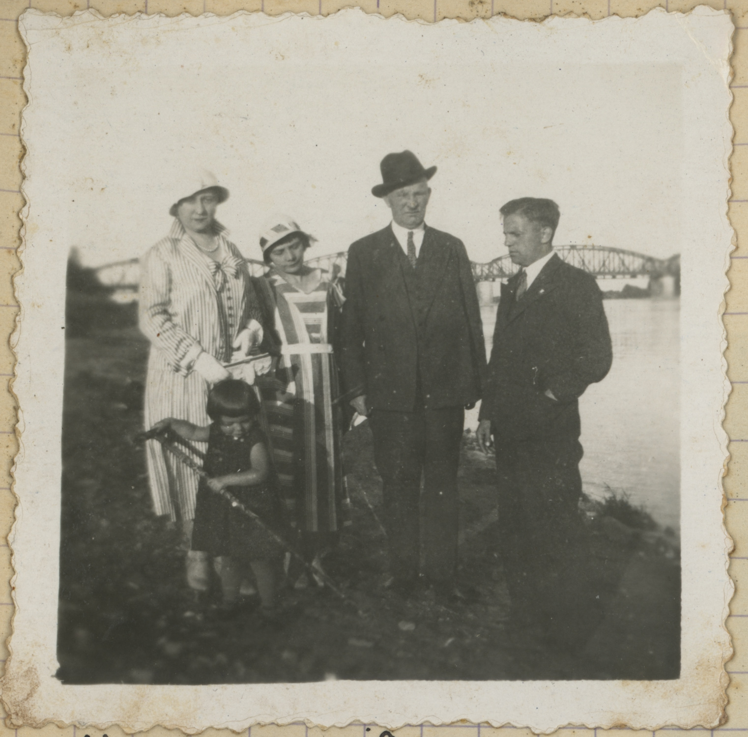 • fotografia ; portret ; kobieta ; mężczyzna ; dziecko ; dziewczynka ; moda ; moda międzywojenna ; rzeka ; Wisła ; most ; most w Toruniu