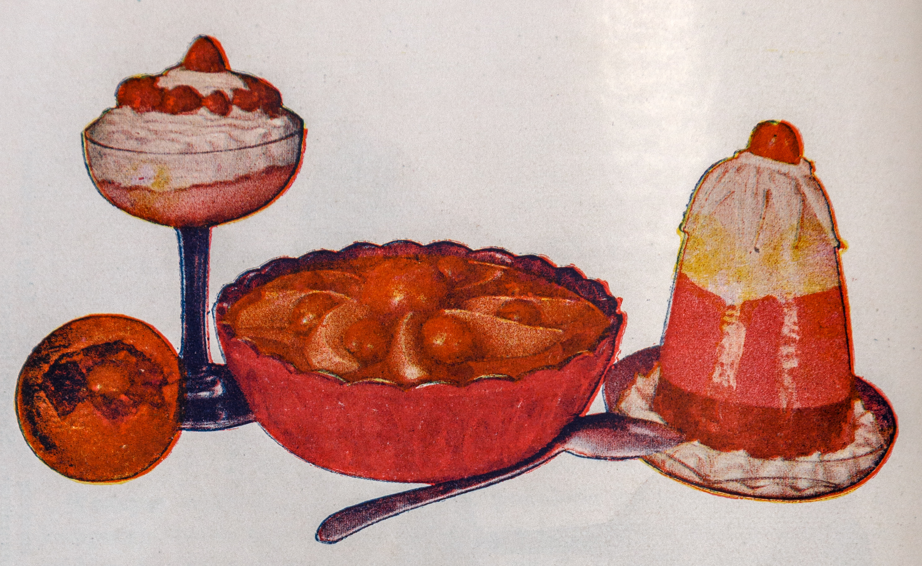 - książka kucharska ; książka ; kuchnia polska ; przepis kulinarny ; gotowanie ; potrawa ; danie ; deser ; zastawa stołowa ; nakrycie stołu ; stół ; lody ; galaretka ; muszka ; owoce