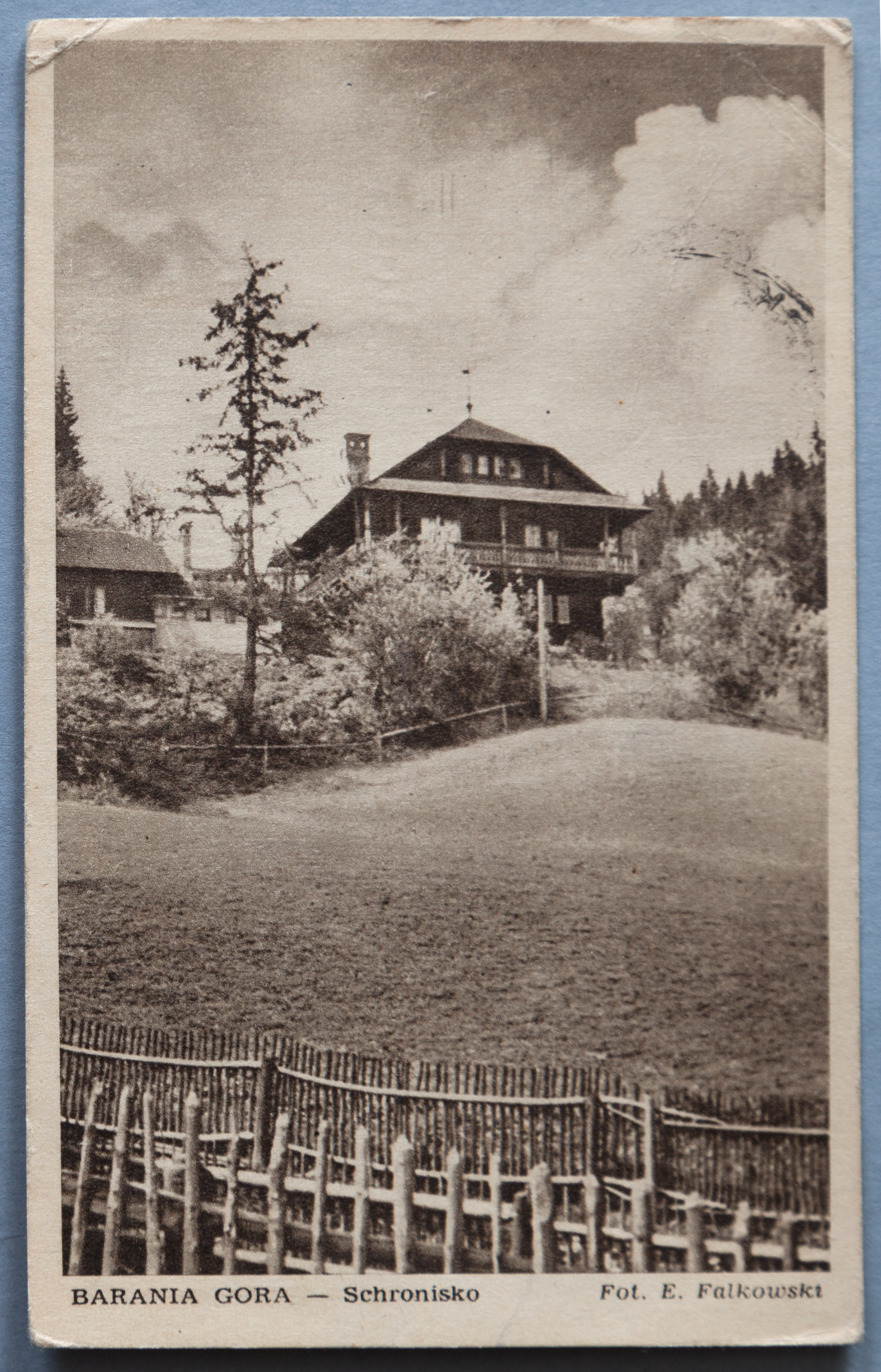 • pocztówka ; Barania Góra ; budynek ; roślinność ; ogrodzenie ; góry