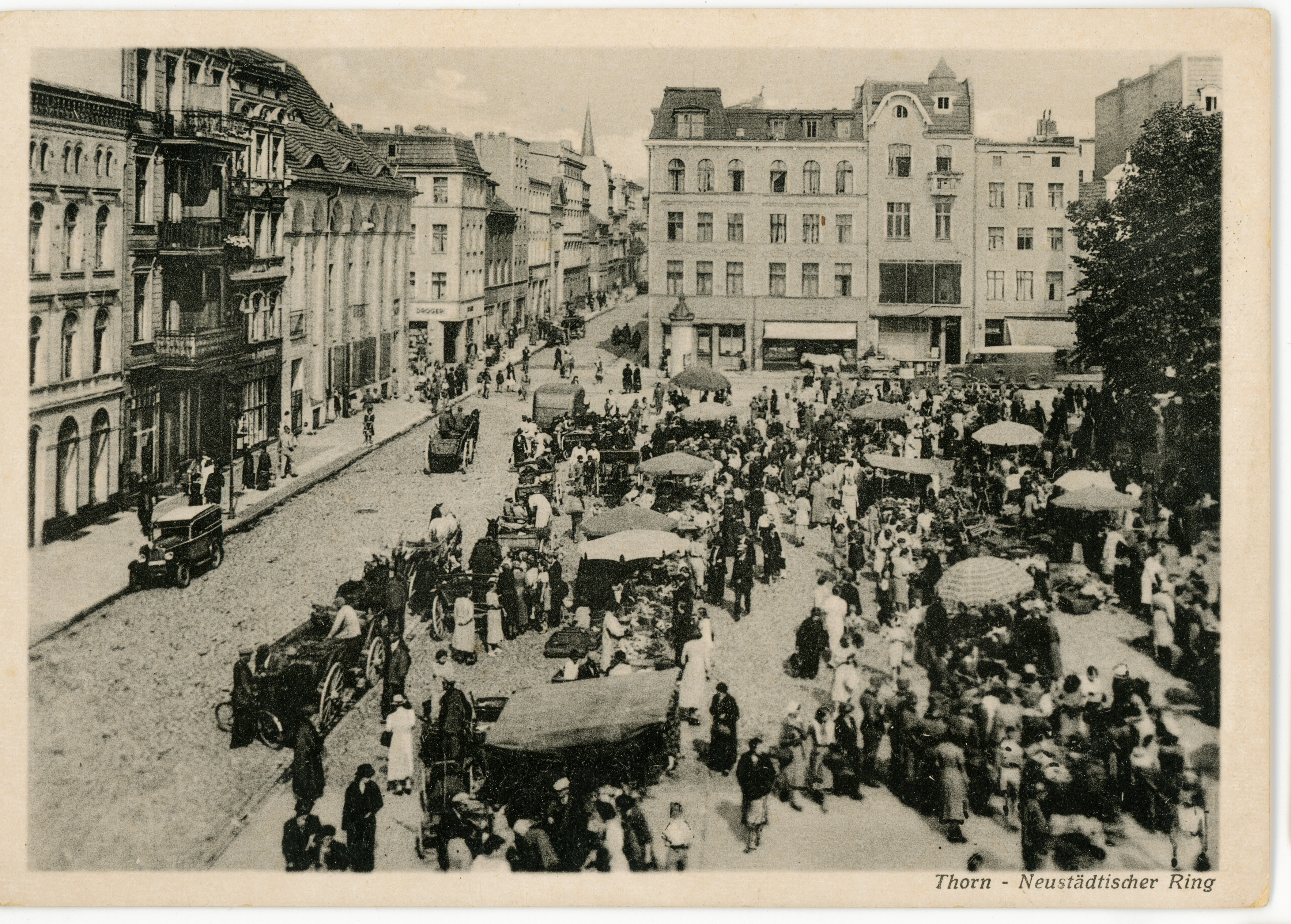 • pocztówka ; Rynek Nowomiejski w Toruniu ; kamienica ; targ ; samochód ; wóz ; parasol