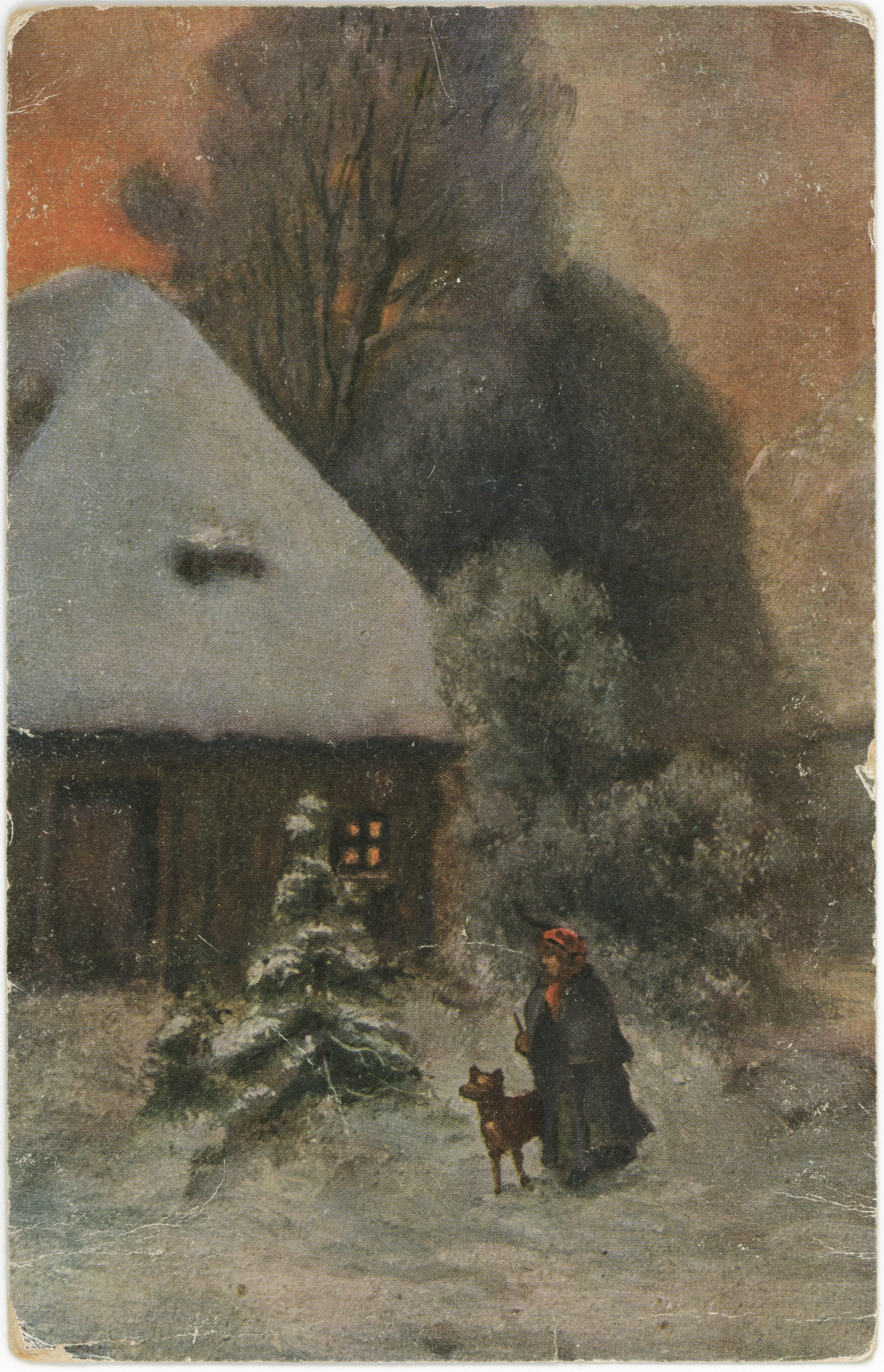 • pocztówka ; malarstwo ; pejzaż ; pejzaż zimowy ; zima ; wieś ; kobieta