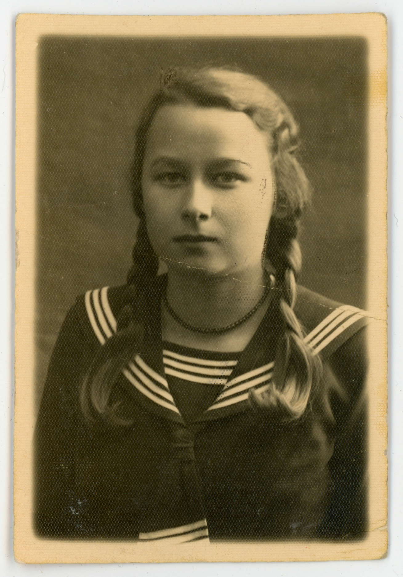 • fotografia ; portret ; kobieta ; naszyjnik ; strój marynarski ; zakład fotograficzny ; atelier fotograficzne