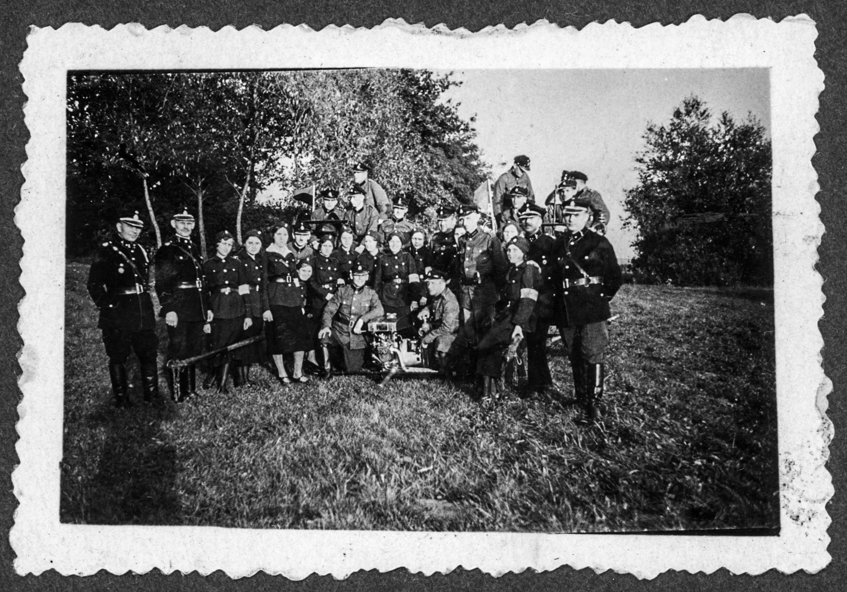 • fotografia ; portret ; Ochotnicza Straż Pożarna ; Samarytanka ; straż pożarna ; Straż Ogniowa ; mundur strażacki ; mężczyzna ; kobieta ; motopompa ; Pluskowęsy