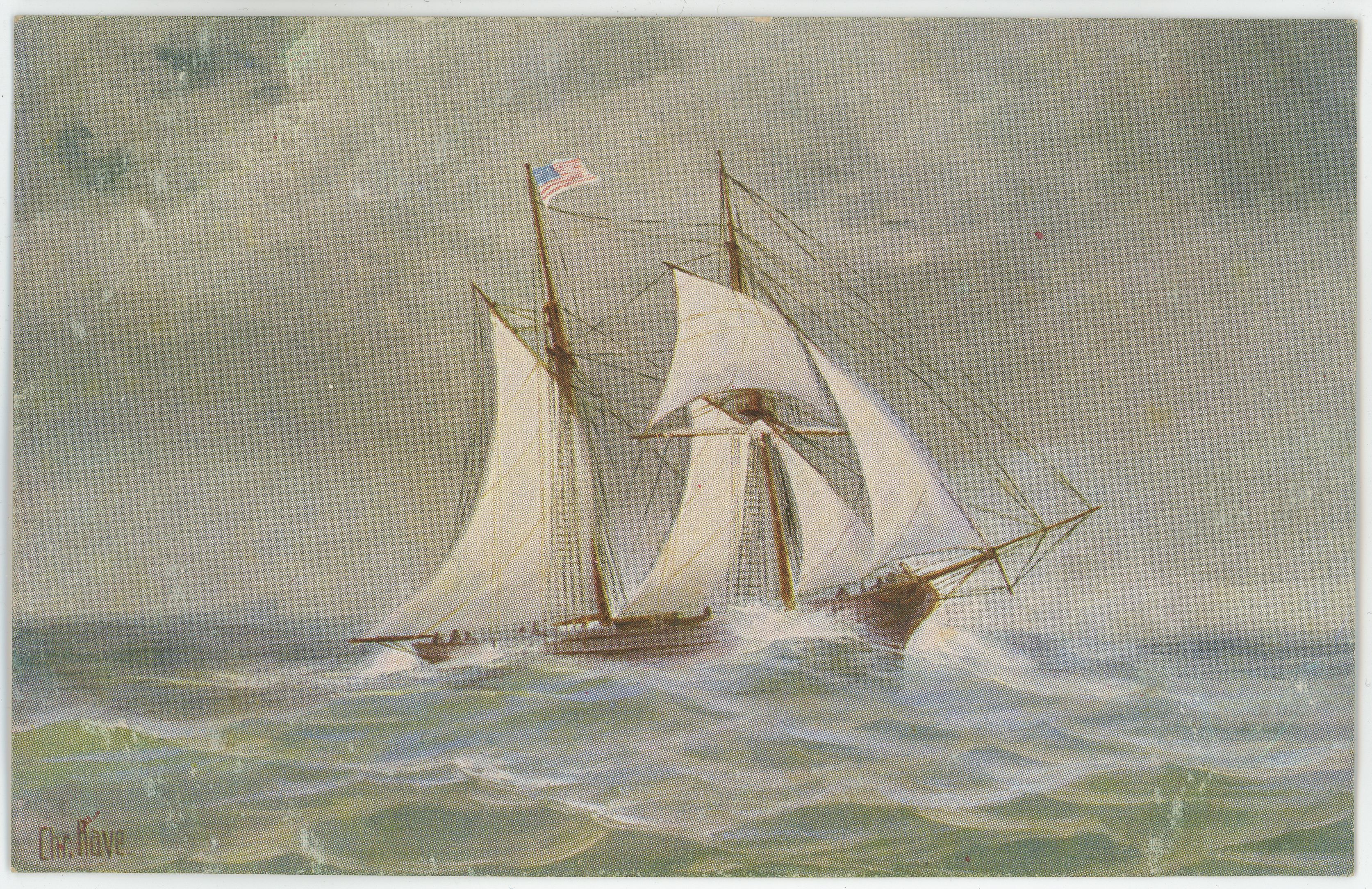 • pocztówka ; obraz ; statek ; brygantyna ; żegluga ; marynistyka ; morze ; żagiel ; żaglowiec
