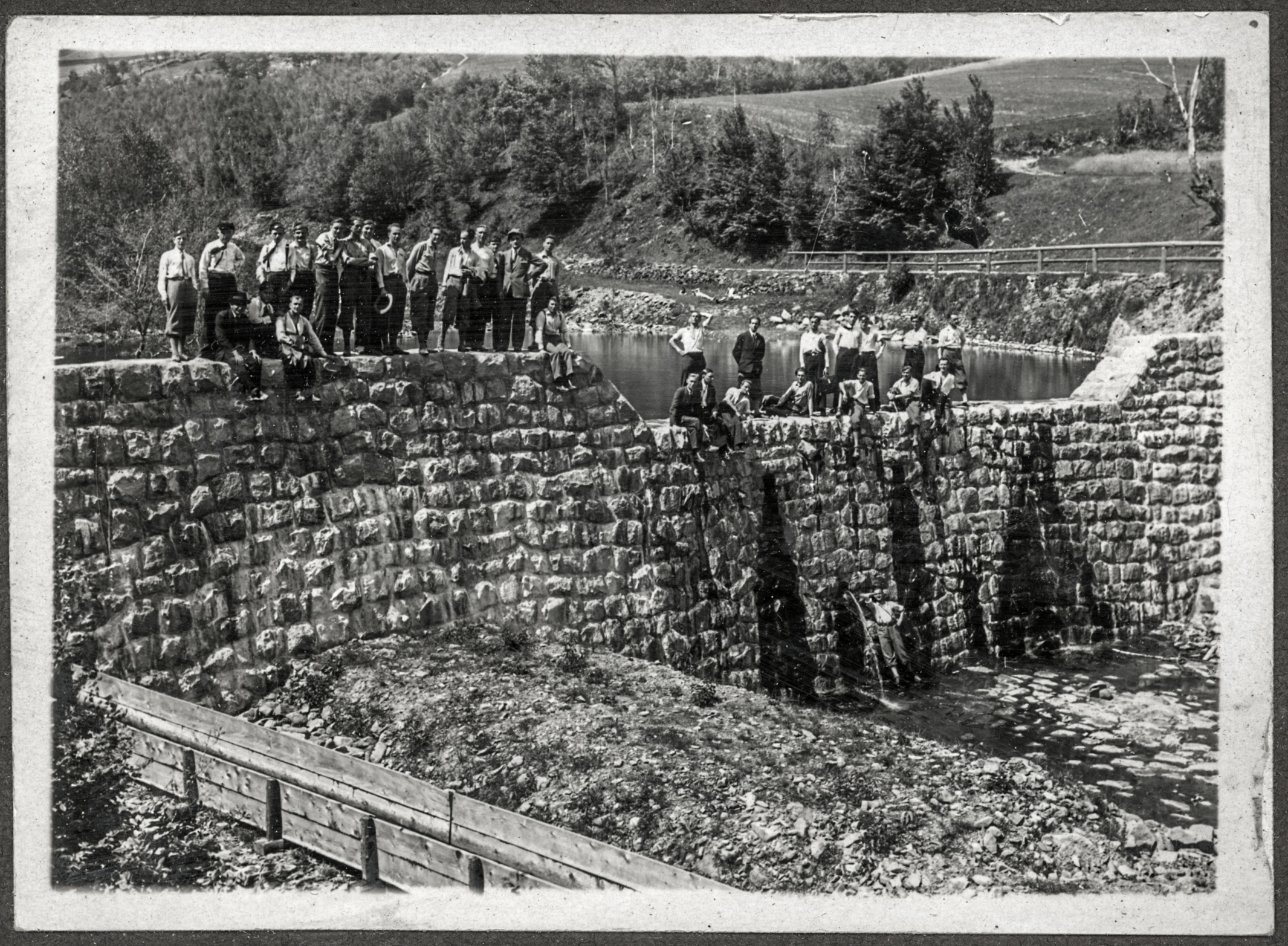 • fotografia ; mężczyzna ; uczeń ; Państwowa Szkoła Budownictwa w Poznaniu ; próg rzeczny ; rzeka ; Soła ; droga