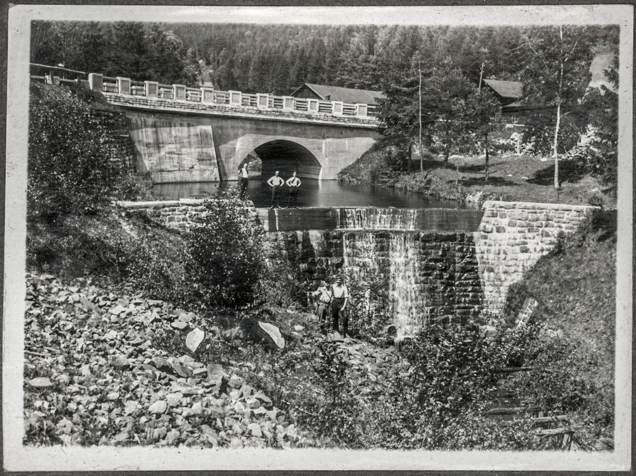 - fotografia ; mężczyzna ; uczeń ; Państwowa Szkoła Budownictwa w Poznaniu ; rzeka ; Soła ; jaz ; most ; budynek ; las