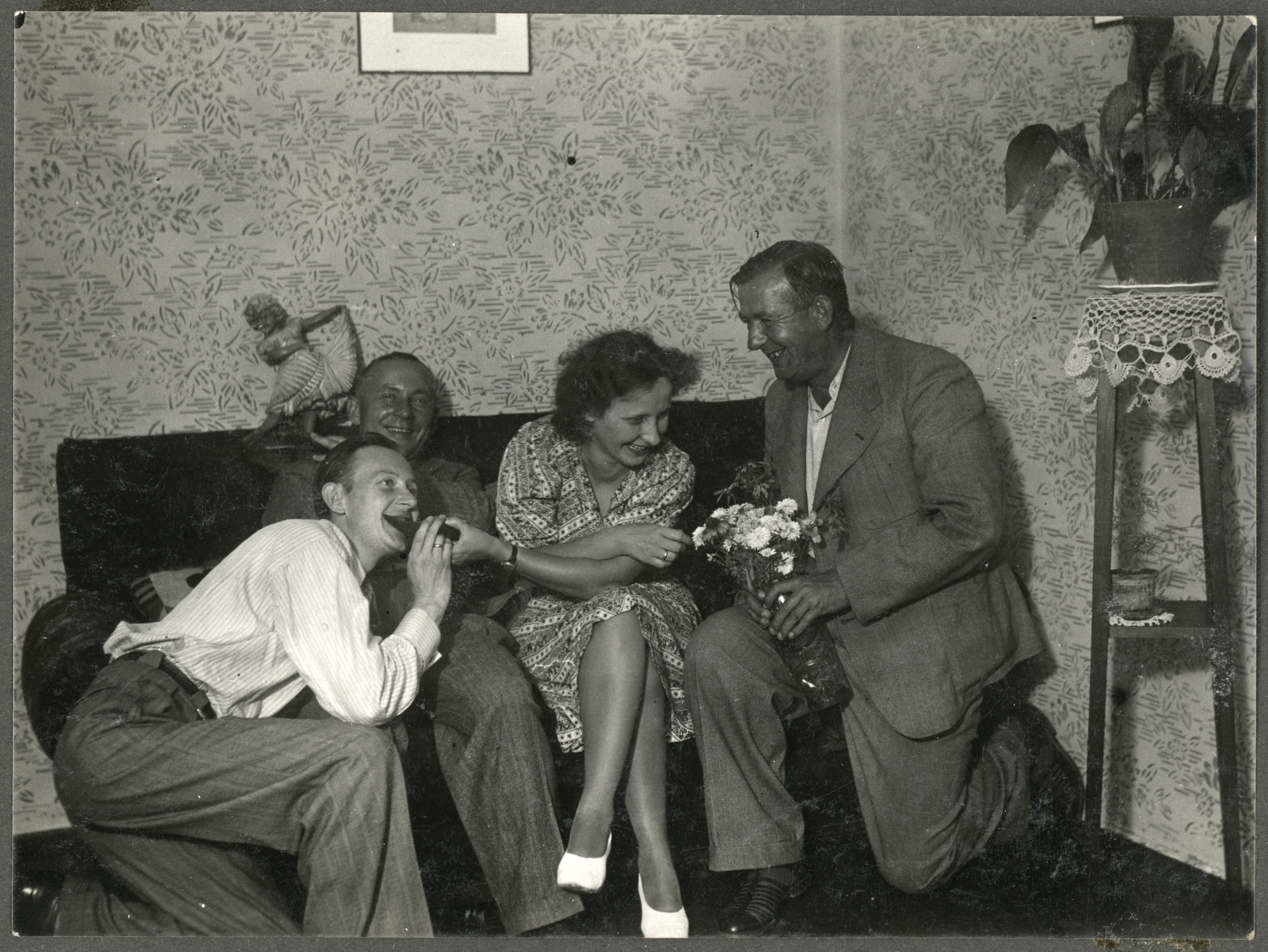 • fotografia ; kobieta ; mężczyzna ; kwiaty ; figurka ; łóżko ; pokój