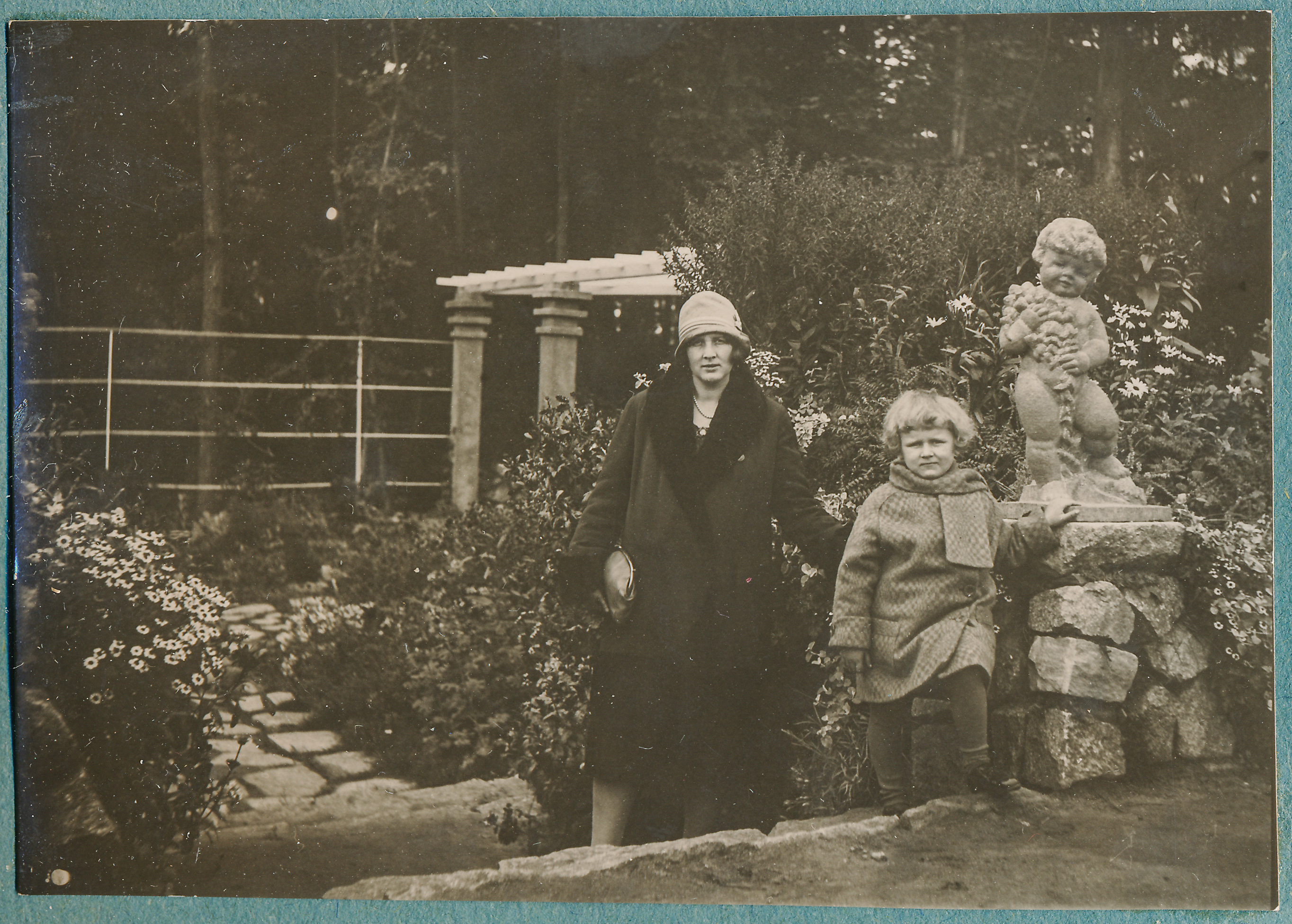 • fotografia ; portret ; kobieta ; dziecko ; rzeźba ; ogród ; Wystawa Ogrodnicza w Toruniu ; Pomorska Wystawa Ogrodniczo-Przemysłowa