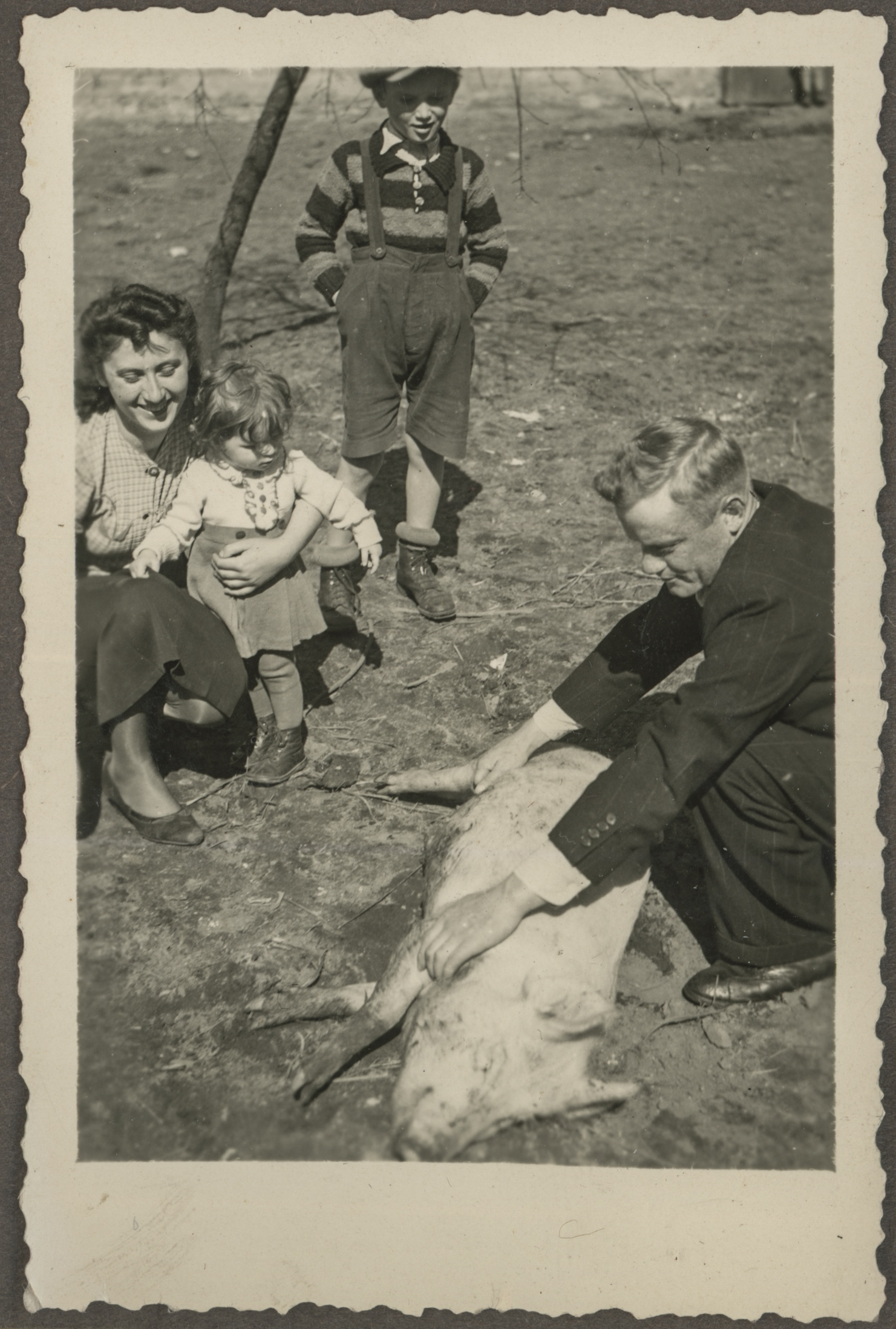 • fotografia ; kobieta ; mężczyzna ; dziecko ; świnia ; wieś ; moda ; moda okresu II wojny światowej