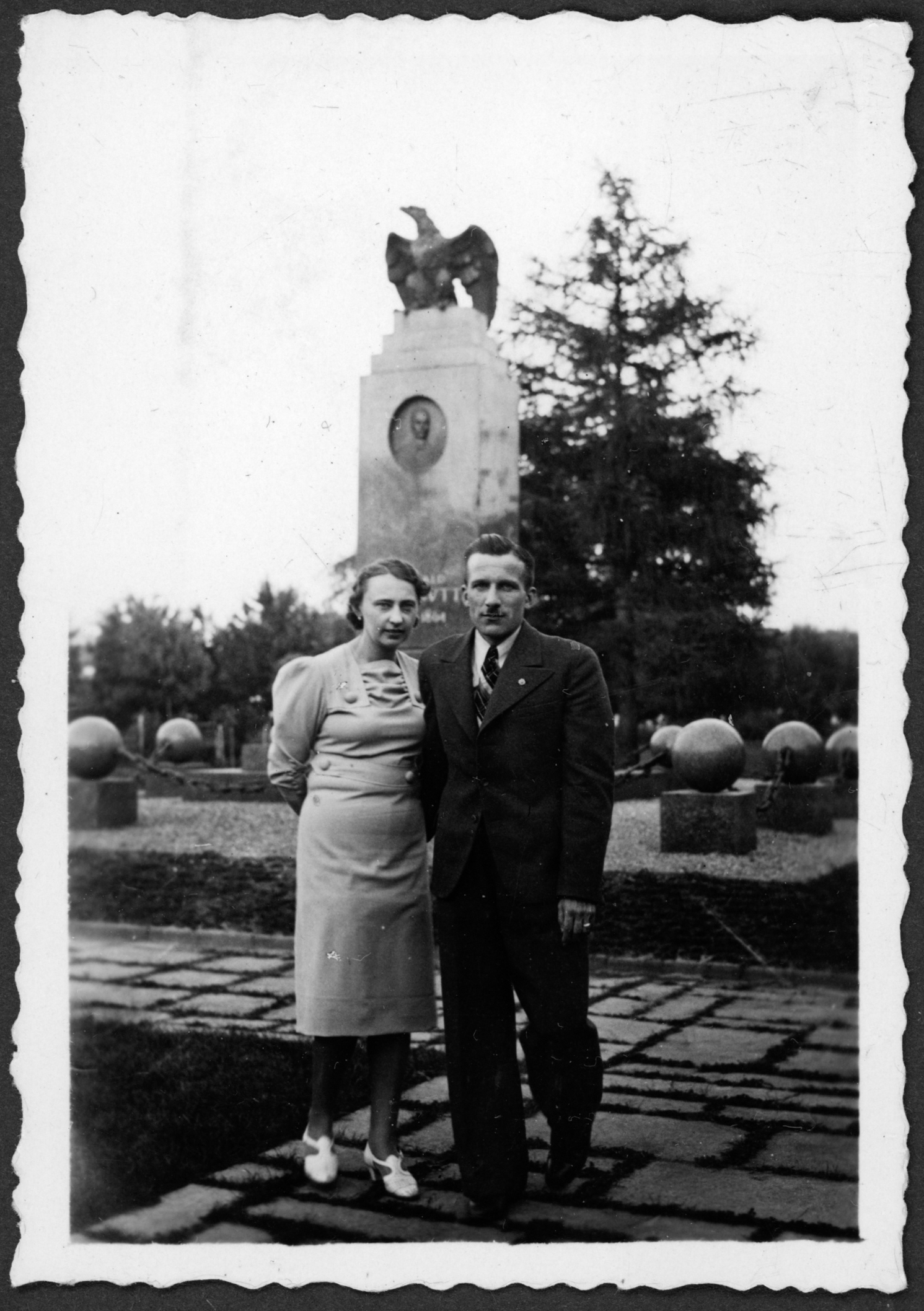 • fotografia ; portret ; kobieta ; mężczyzna ; pomnik ; pomnik Romualda Traugutta w Ciechocinku ; plener