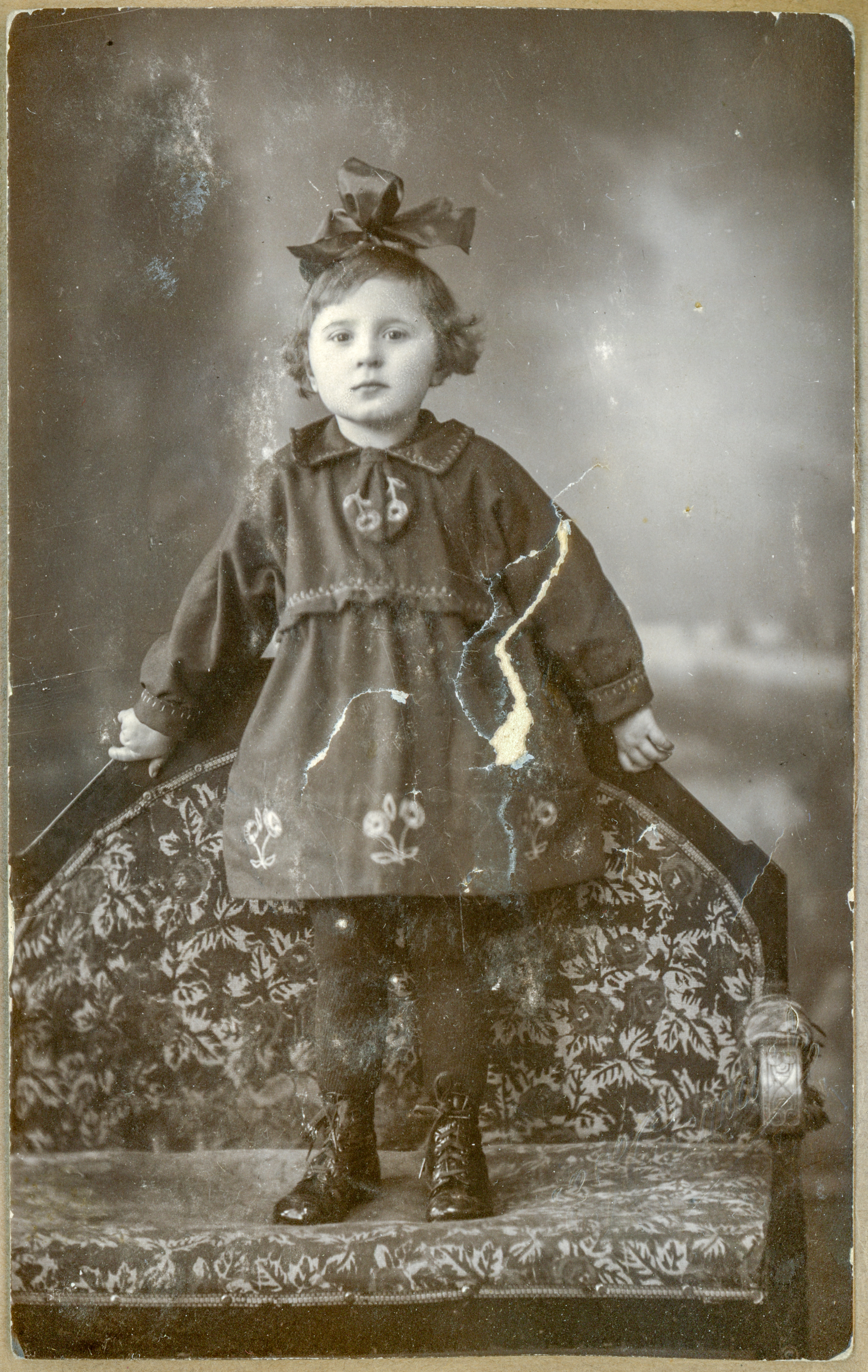 • fotografia ; portret ; dziewczynka ; kokarda ; fotel ; atelier fotograficzne ; zakład fotograficzny