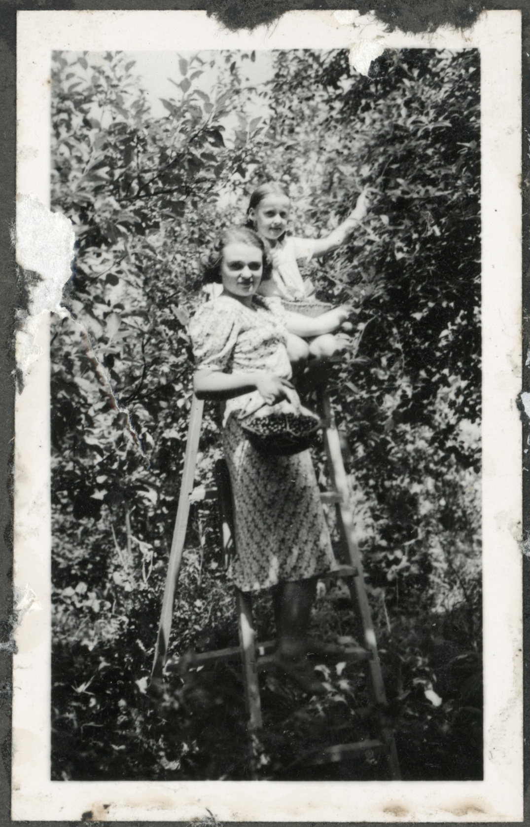 • fotografia ; kobieta ; dziewczynka ; drabina ; sad
