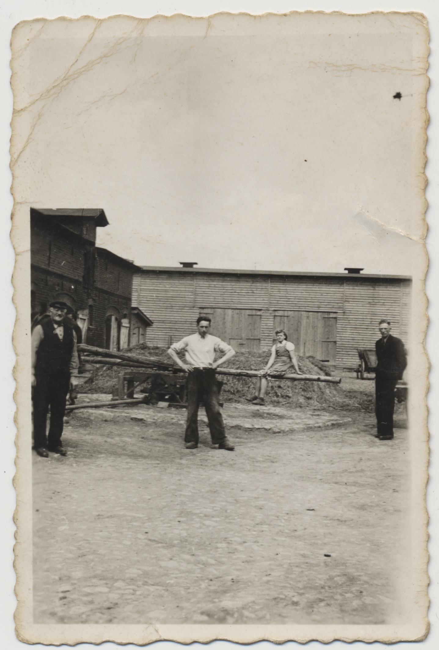 • fotografia ; kobieta ; mężczyzna ; wieś ; rolnictwo ; podwórze ; kierat ; budynek gospodarczy ; moda ; moda okresu II wojny światowej