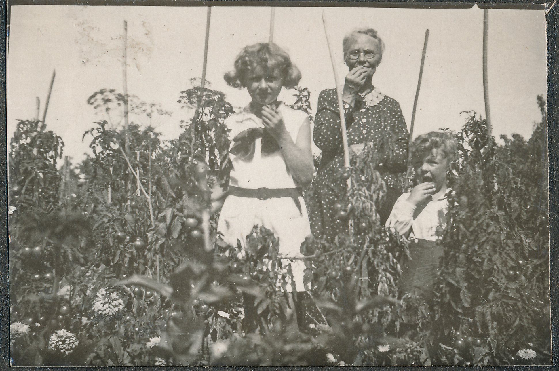 - fotografia ; kobieta ; dziecko ; chłopiec ; dziewczynka ; niania ; ogród ; pomidor ; uprawa ; moda ; moda międzywojenna ; moda dziecięca