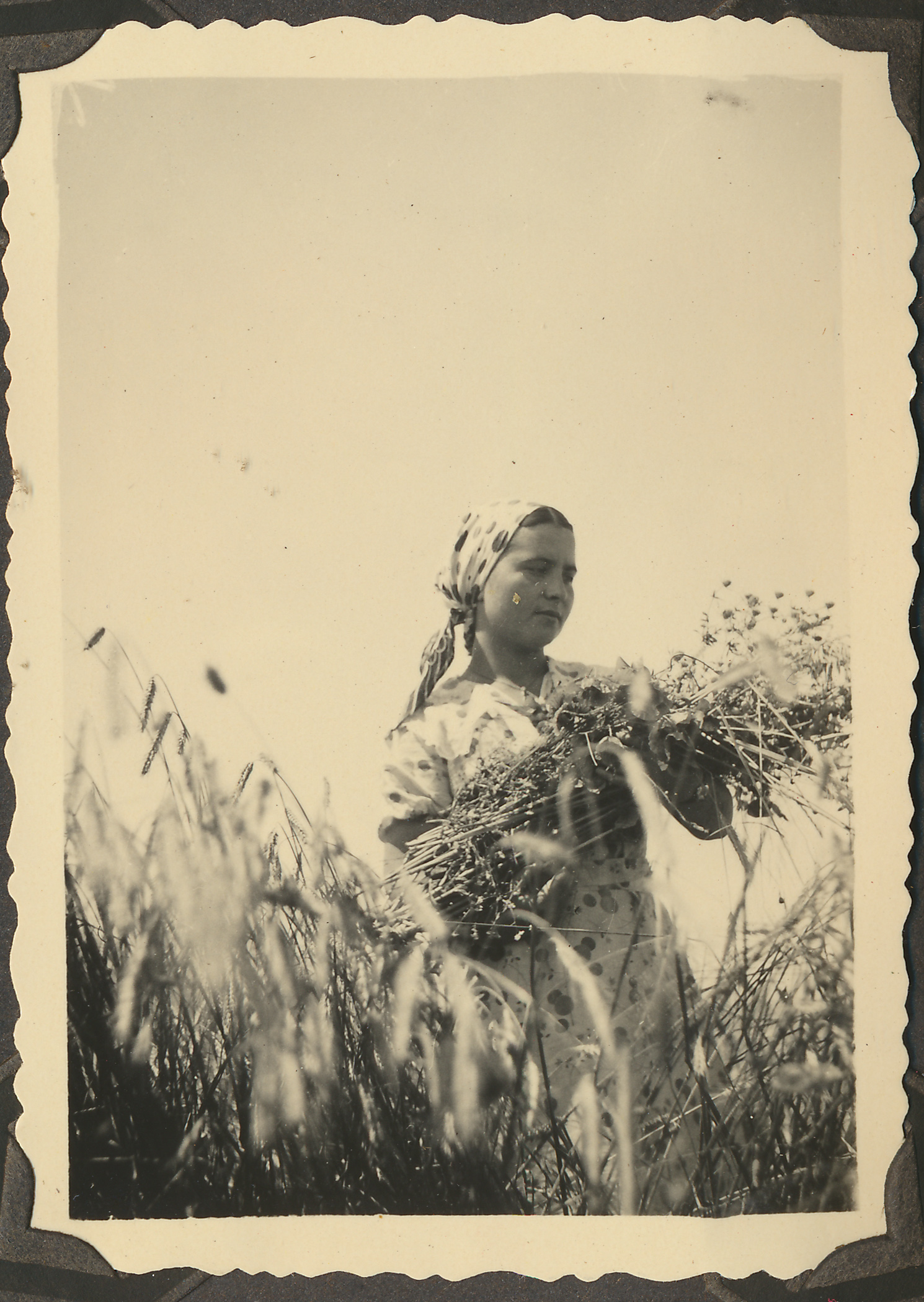 - fotografia ; dziewczyna ; kobieta ; pole uprawne ; zboże ; bukiet ; wieś ; moda ; moda międzywojenna