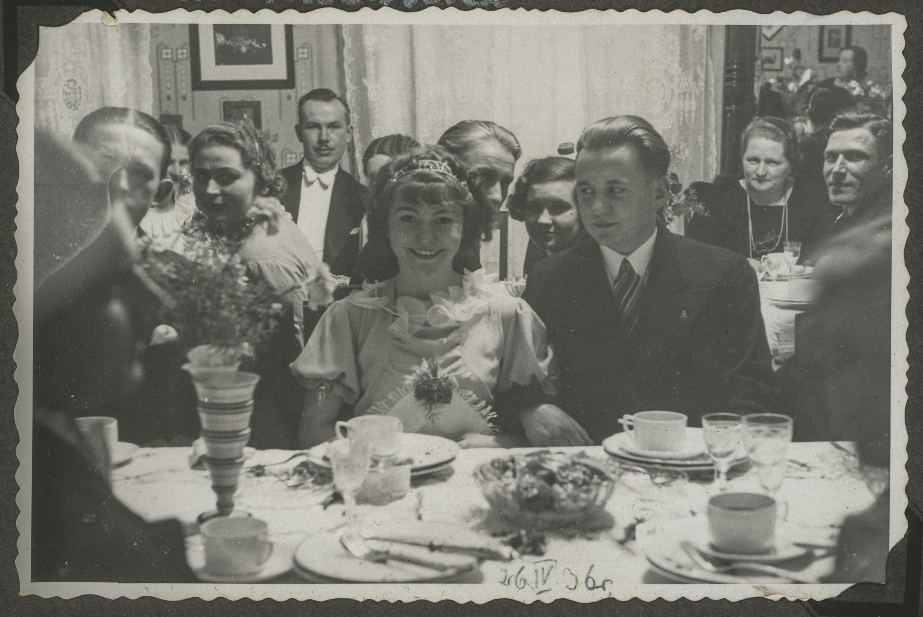 - fotografia ; portret ; wesele ; przyjęcie weselne ; obiad ; jedzenie ; stół ; zastawa stołowa ; ślub ; pan młody ; panna młoda ; moda ; moda międzywojenna