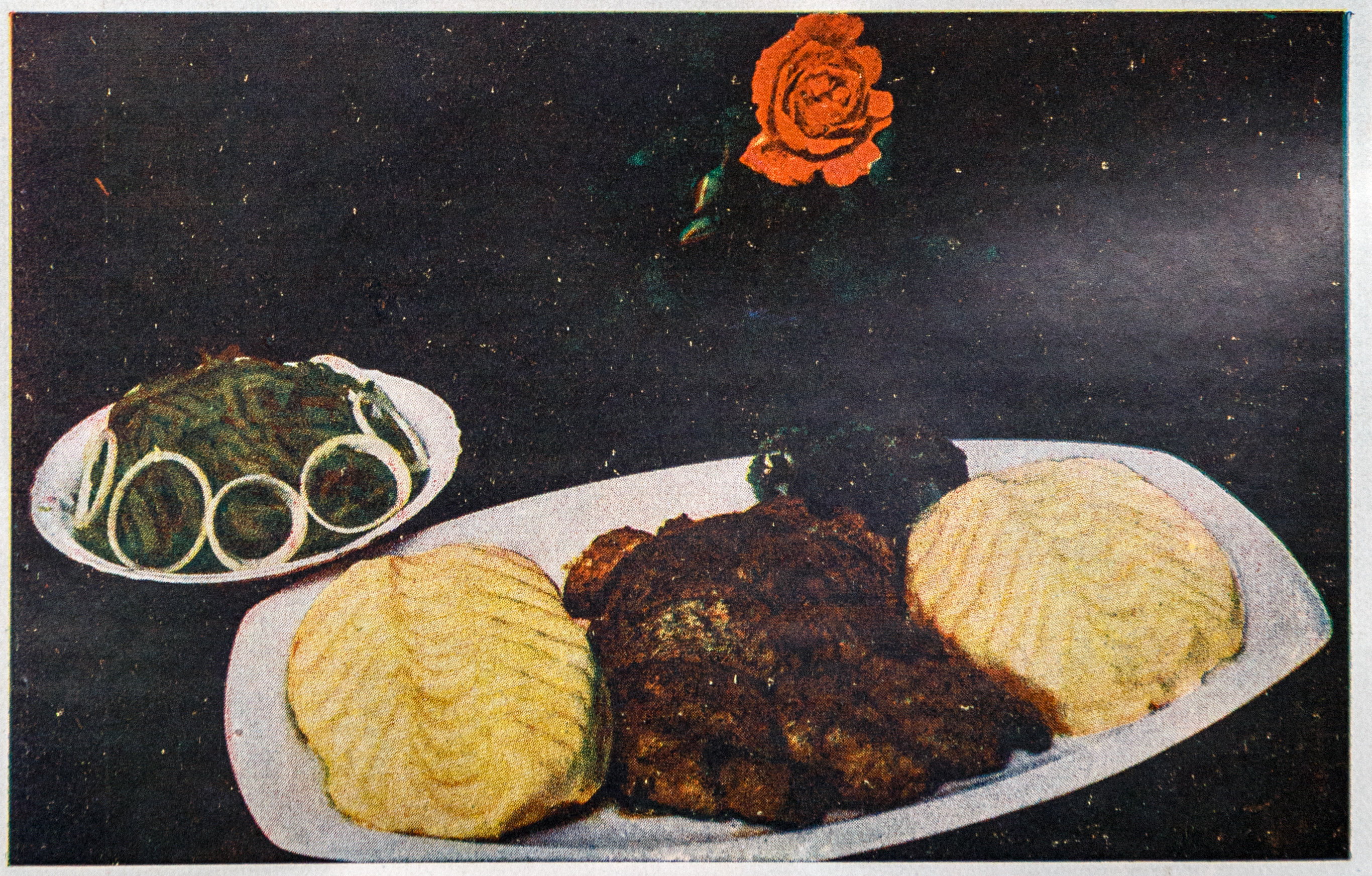 • książka kucharska ; książka ; kuchnia polska ; przepis kulinarny ; gotowanie ; potrawa ; danie ; zastawa stołowa ; nakrycie stołu ; stół ; wątróbka ; cielęcina ; mięso ; warzywa