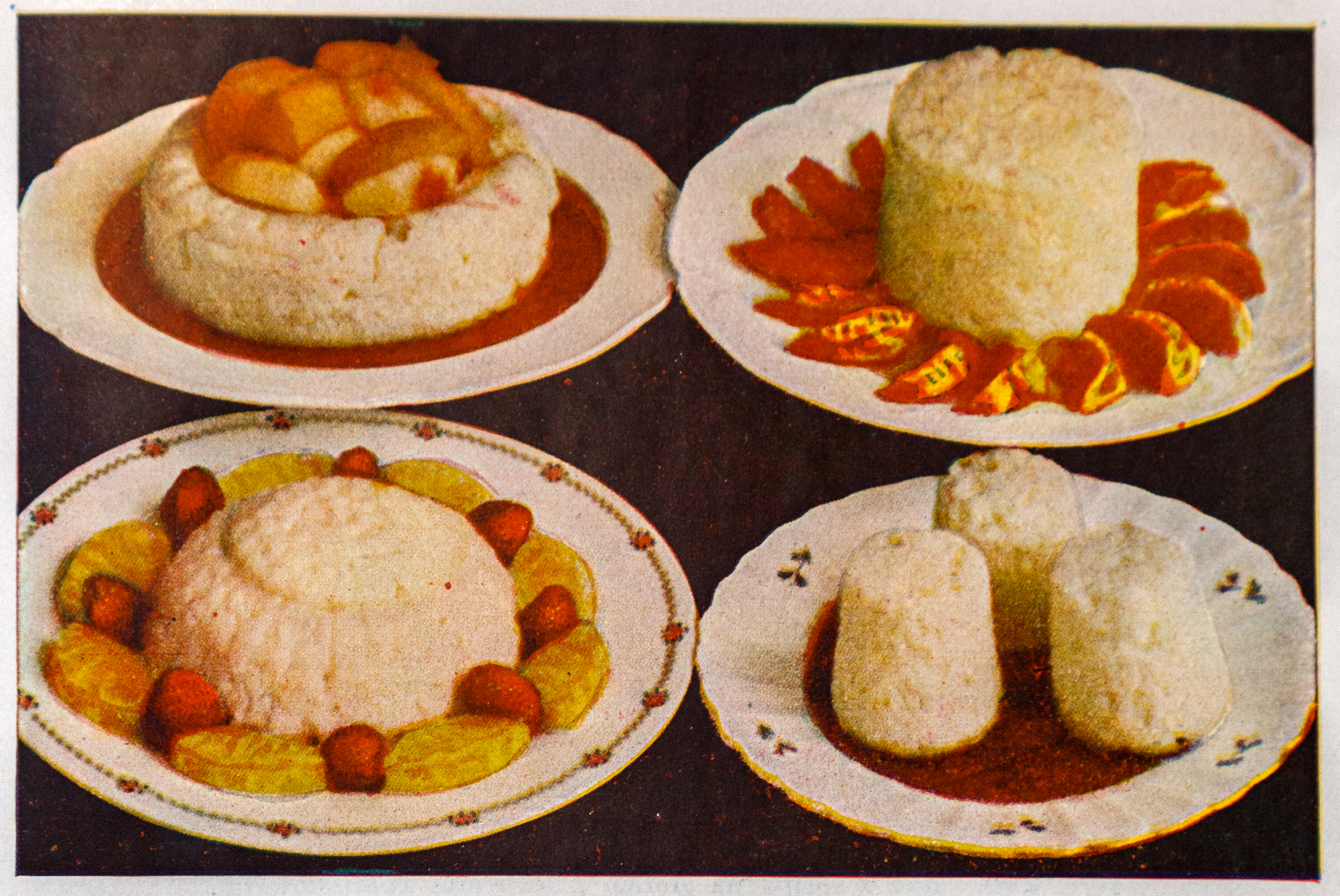 • książka kucharska ; książka ; kuchnia polska ; przepis kulinarny ; gotowanie ; potrawa ; danie ; deser ; zastawa stołowa ; nakrycie stołu ; ryż ; forma ; krem ryżowy