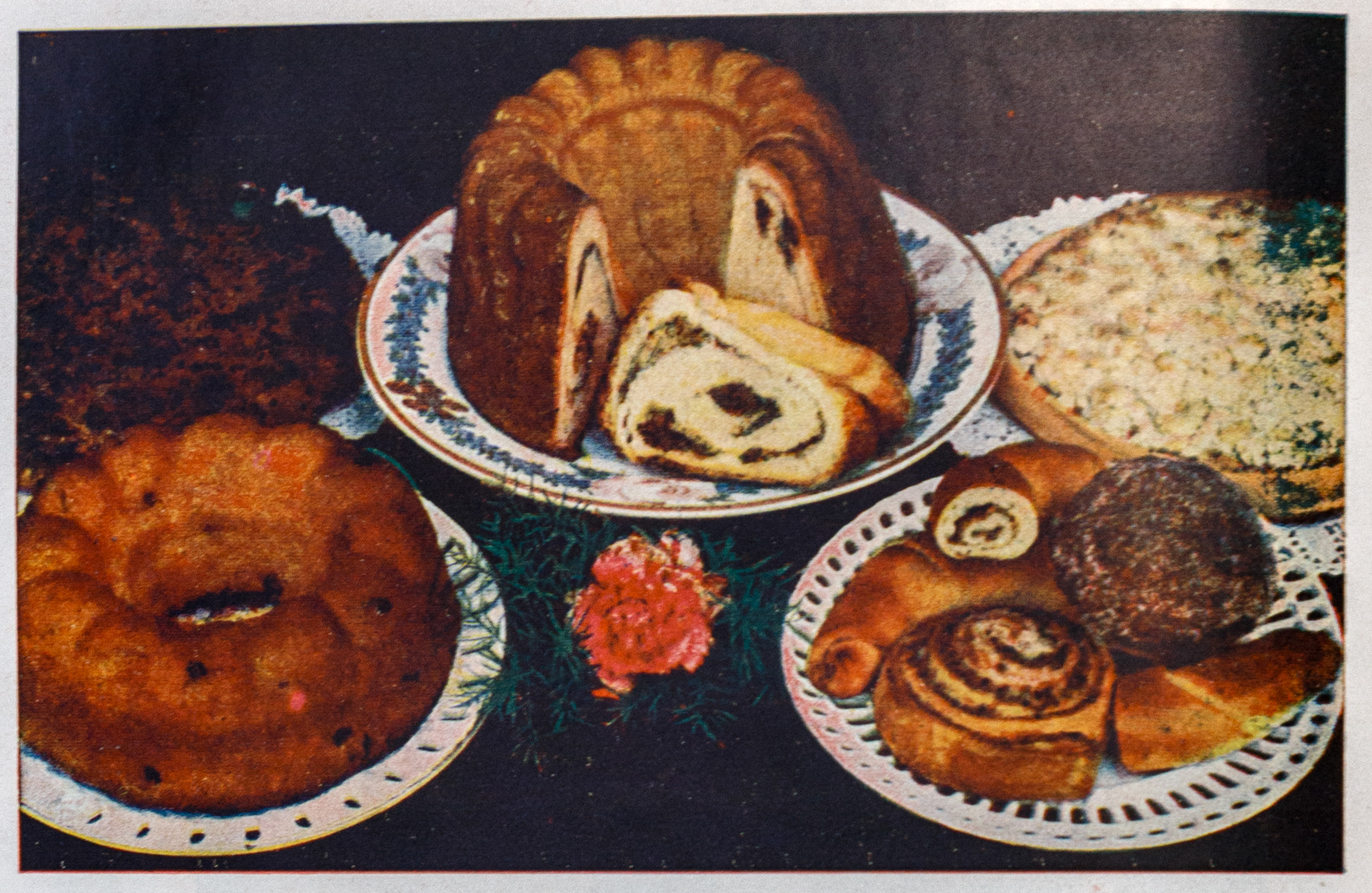 • książka kucharska ; książka ; kuchnia polska ; przepis kulinarny ; gotowanie ; potrawa ; danie ; deser ; zastawa stołowa ; nakrycie stołu ; stół ; ciastko ; ciasto ; babka drożdżowa ; Savarin ; babka ponczowa ; pączek