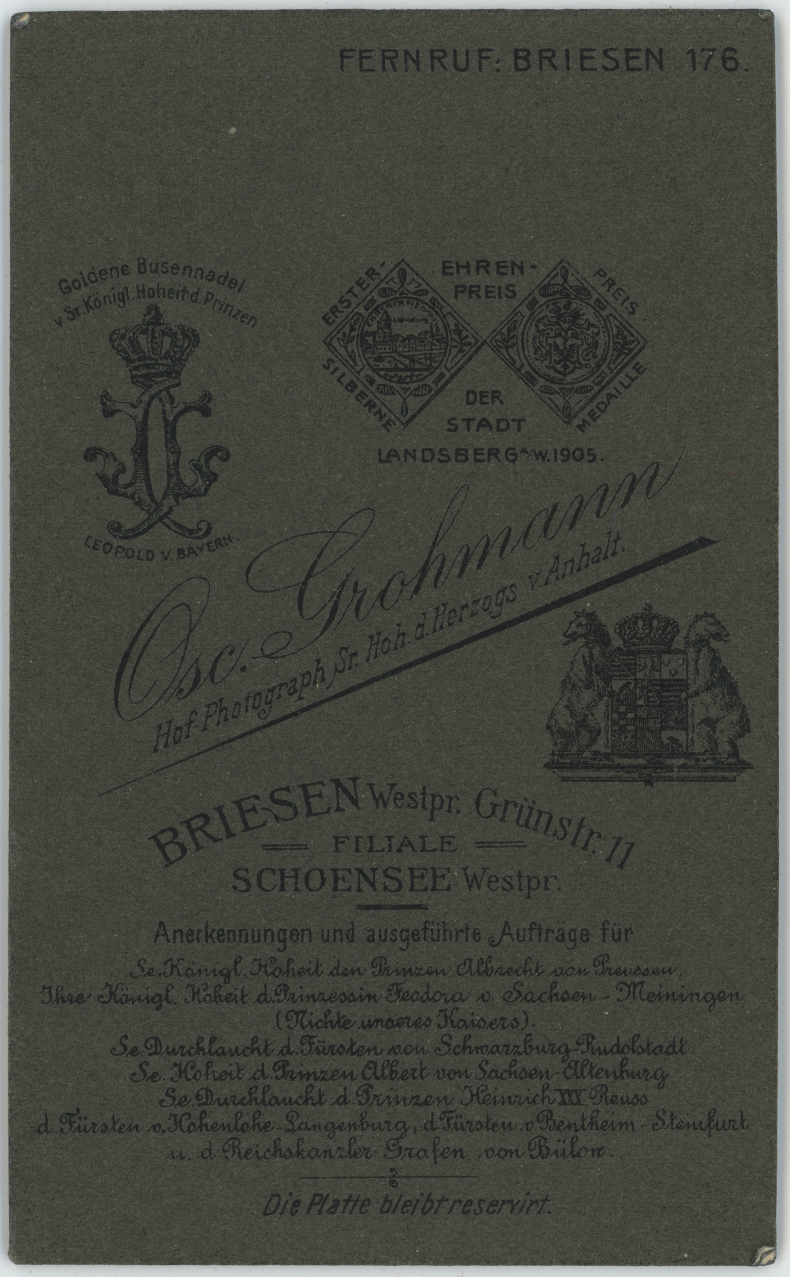 • fotografia ; portret ; atelier fotograficzne ; kobieta ; mężczyzna ; dziecko ; chłopiec ; małżeństwo ; rodzina ; moda ; moda przełomu XIX i XX w. ; moda dziecięca ; fryzura ; Briesen Westpr. ; Wąbrzeźno