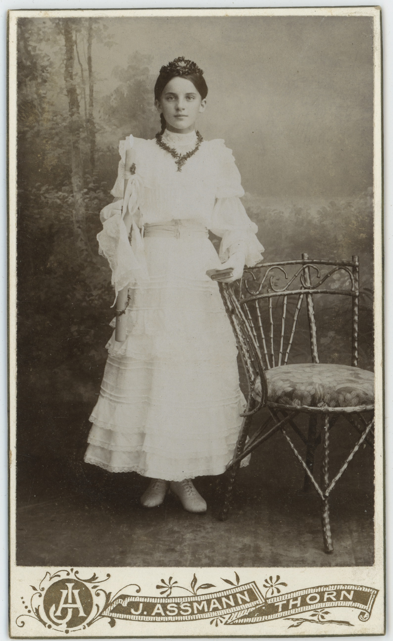 • fotografia ; portret ; atelier fotograficzne ; dziecko ; dziewczynka ; I Komunia Święta ; religia ; moda ; moda komunijna ; moda przełomu XIX i XX w. ; fryzura ; krzesło ; Thorn ; Toruń