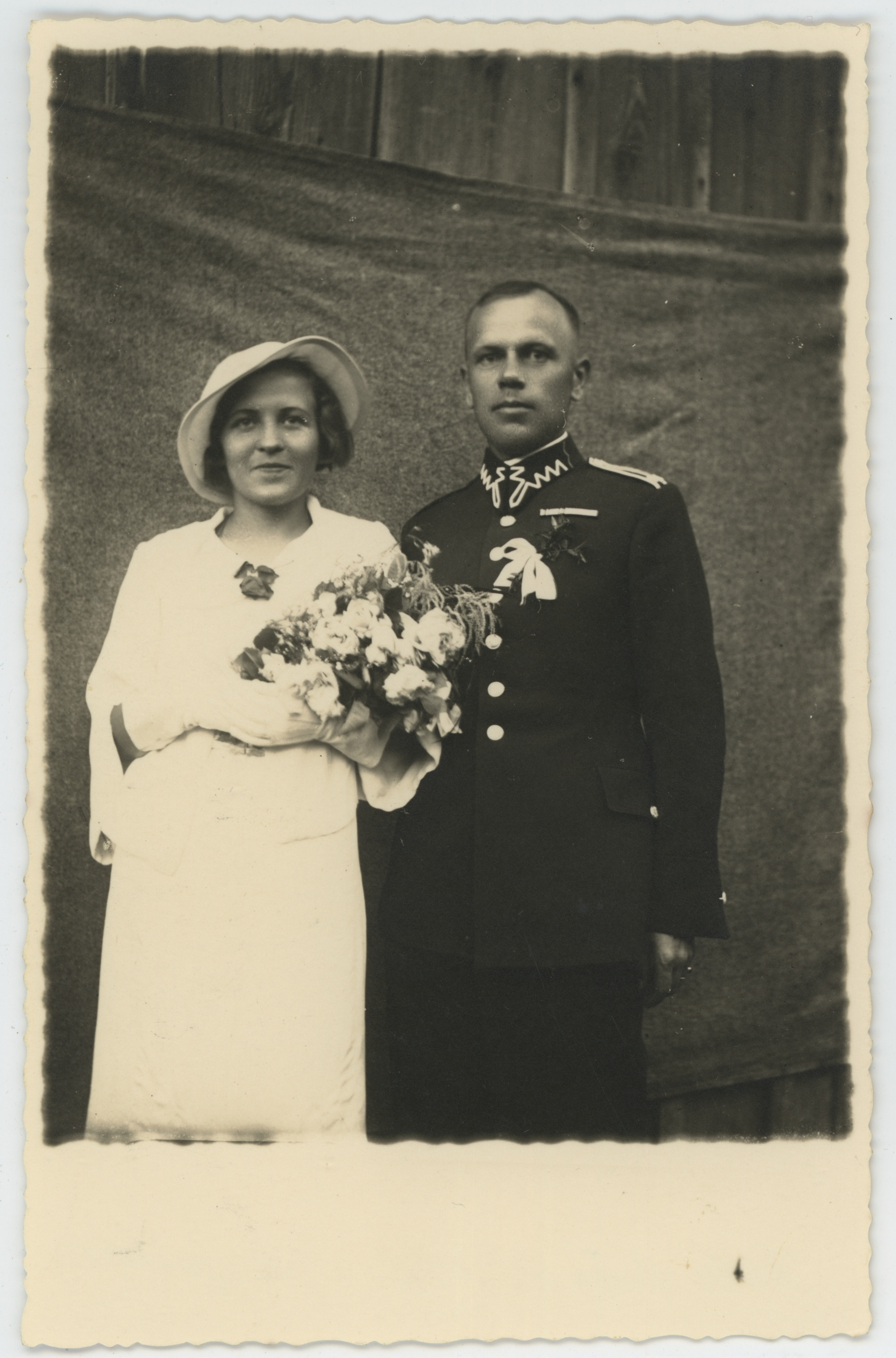 • fotografia ; portret ; portret ślubny ; ślub ; małżeństwo ; kobieta ; mężczyzna ; moda ; moda międzywojenna ; żołnierz ; mundur ; mundur wojska polskiego