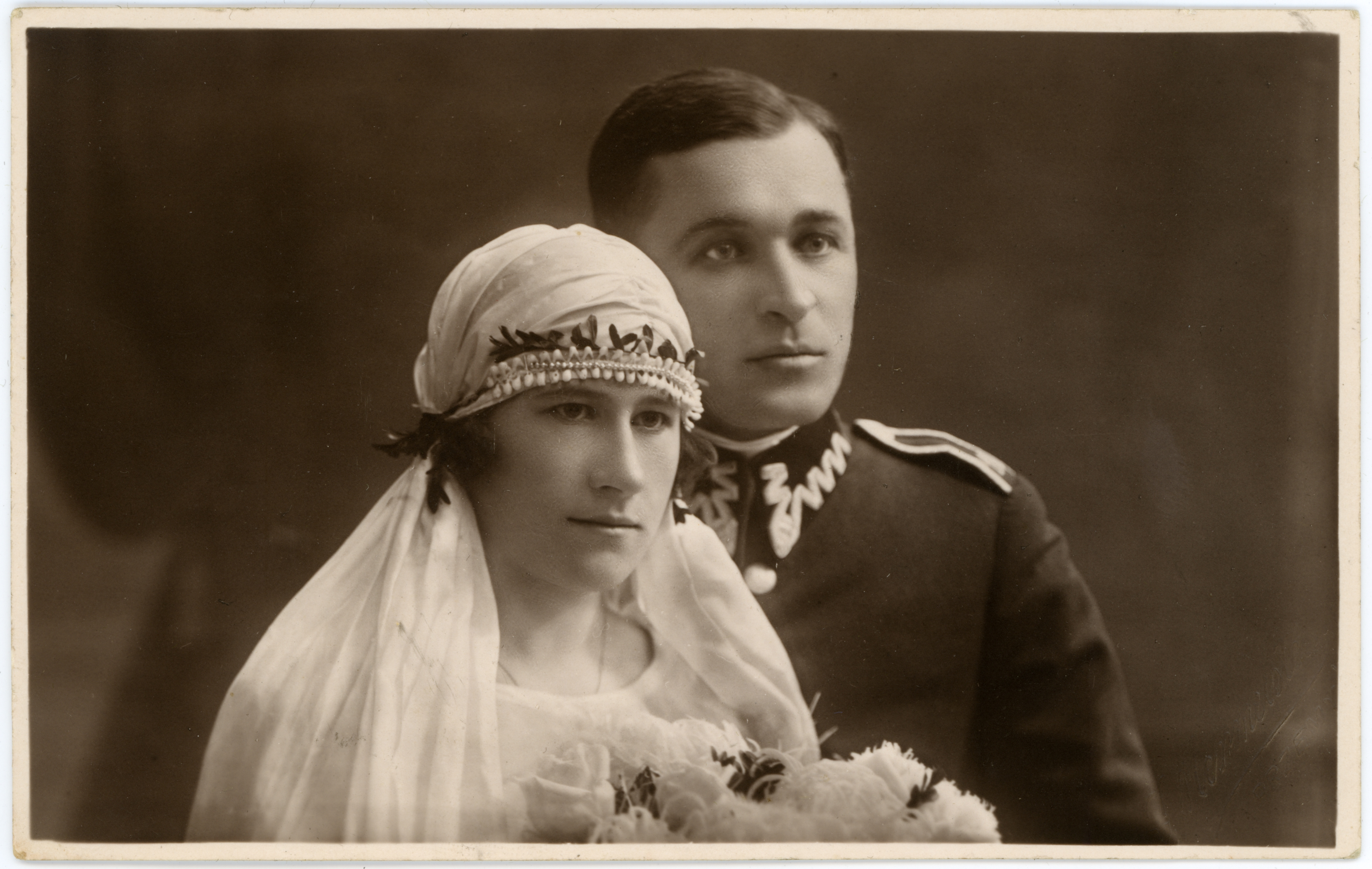 - fotografia ; portret ; portret ślubny ; małżeństwo ; ślub ; kobieta ; mężczyzna ; moda ; moda międzywojenna ; żołnierz ; mundur ; mundur wojska polskiego