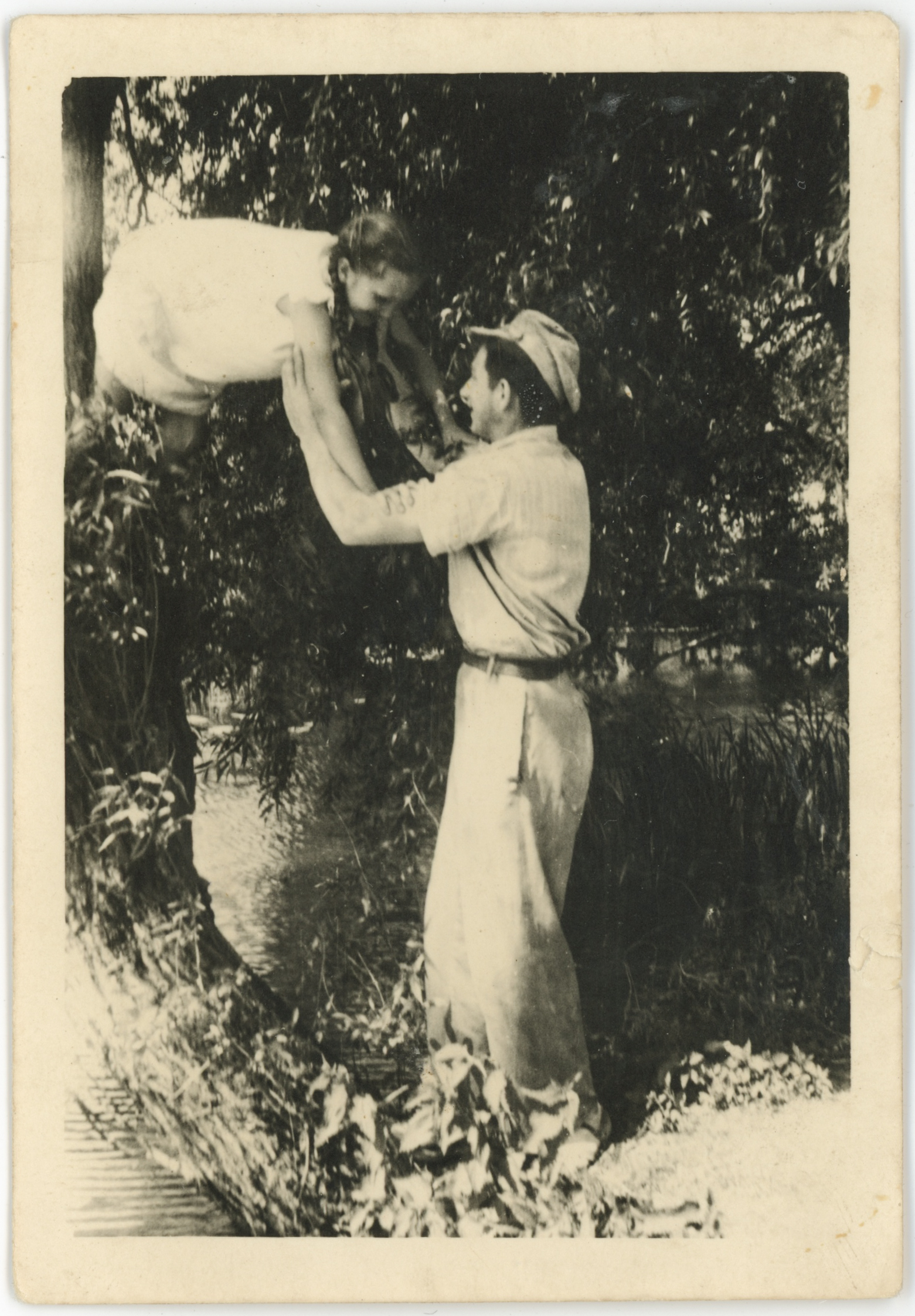 Portret - mężczyzna pomagający zejść z drzewa dziewczynce