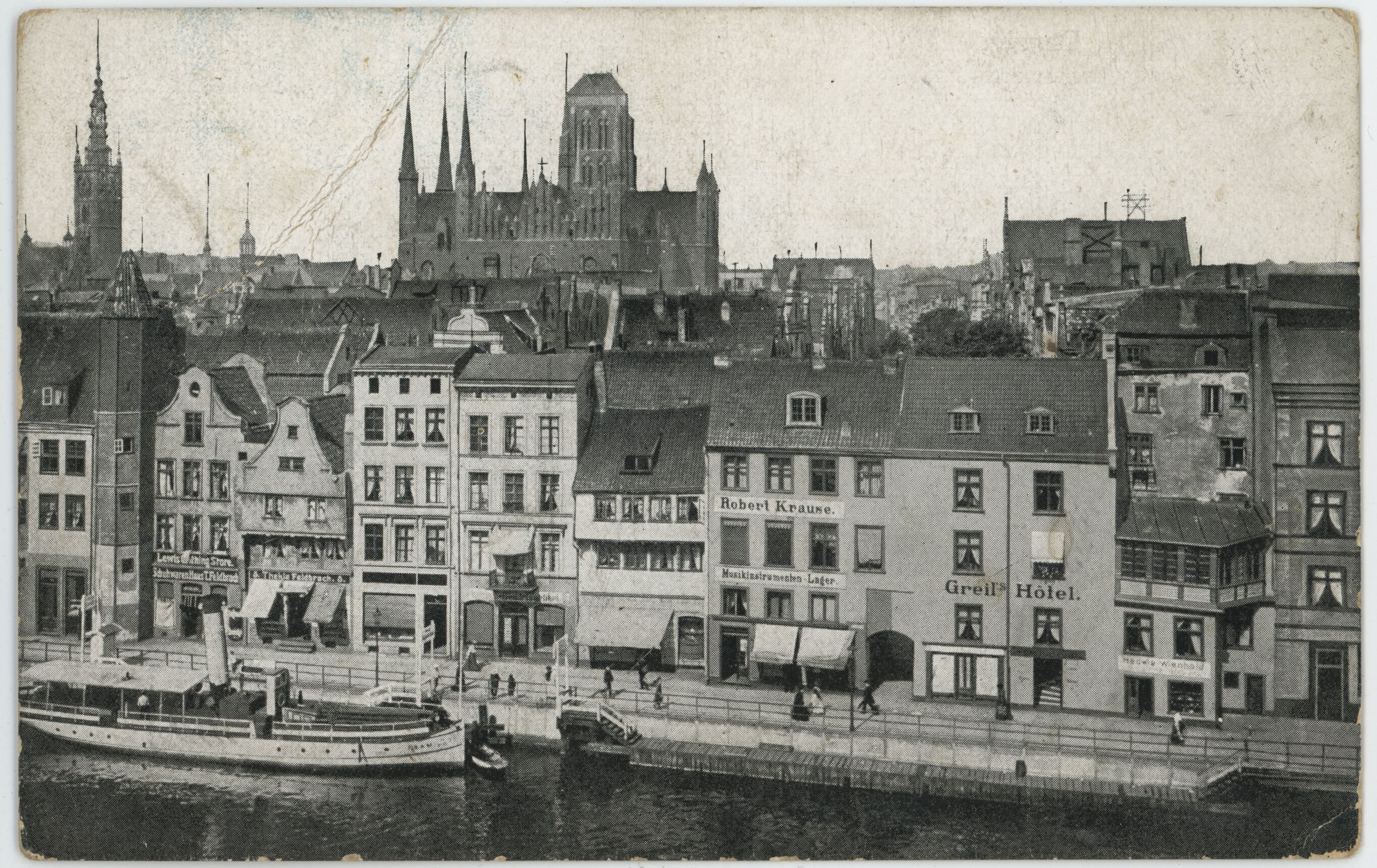 • pocztówka ; fotografia ; architektura ; architektura gotycka ; gotyk ; architektura renesansowa ; renesans ; Bazylika Mariacka w Gdańsku ; Motława ; Ratusz Głównego Miasta w Gdańsku
